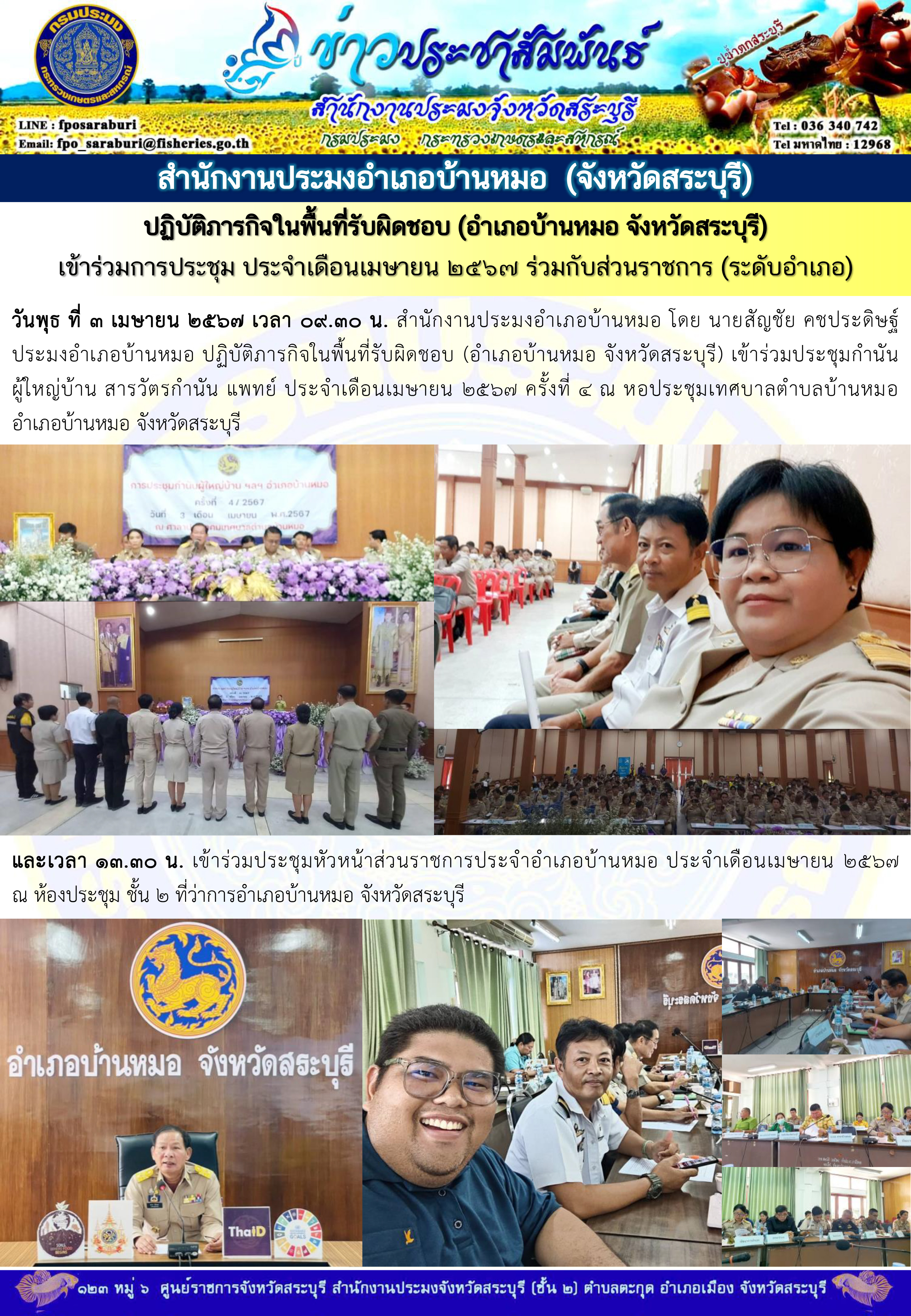 สำนักงานประมงอำเภอบ้านหมอ ปฏิบัติภารกิจในพื้นที่รับผิดชอบ (อำเภอบ้านหมอ จังหวัดสระบุรี) เข้าร่วมการประชุม ประจำเดือนเมษายน 2567 ร่วมกับส่วนราชการ (ระดับอำเภอ)