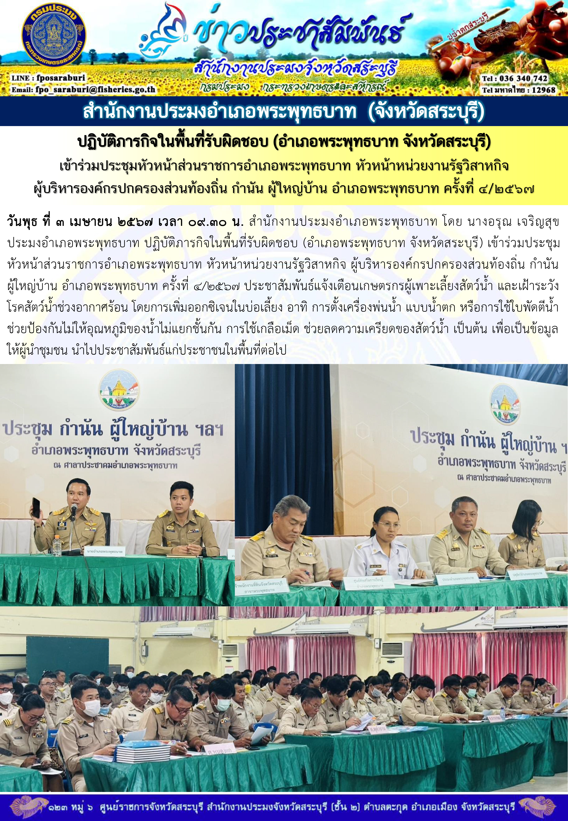 วันพุธ ที่ 3 เมษายน 2567 เวลา 09.30 น. สำนักงานประมงอำเภอพระพุทธบาท โดย นางอรุณ เจริญสุข ประมงอำเภอพระพุทธบาท ปฏิบัติภารกิจในพื้นที่รับผิดชอบ (อำเภอพระพุทธบาท จังหวัดสระบุรี) เข้าร่วมประชุมหัวหน้าส่วนราชการอำเภอพระพุทธบาท หัวหน้าหน่วยงานรัฐวิสาหกิจ ผู้บริหารองค์กรปกครองส่วนท้องถิ่น กำนัน ผู้ใหญ่บ้าน อำเภอพระพุทธบาท ครั้งที่ 4/2567 ประชาสัมพันธ์แจ้งเตือนเกษตรกรผู้เพาะเลี้ยงสัตว์น้ำ และเฝ้าระวังโรคสัตว์น้ำช่วงอากาศร้อน โดยการเพิ่มออกซิเจนในบ่อเลี้ยง อาทิ การตั้งเครื่องพ่นน้ำ แบบน้ำตก หรือการใช้ใบพัดตีน้ำ ช่วยป้องกันไม่ให้อุณหภูมิของน้ำไม่แยกชั้นกัน การใช้เกลือเม็ด ช่วยลดความเครียดของสัตว์น้ำ เป็นต้น เพื่อเป็นข้อมูลให้ผู้นำชุมชน นำไปประชาสัมพันธ์แก่ประชาชนในพื้นที่ต่อไป