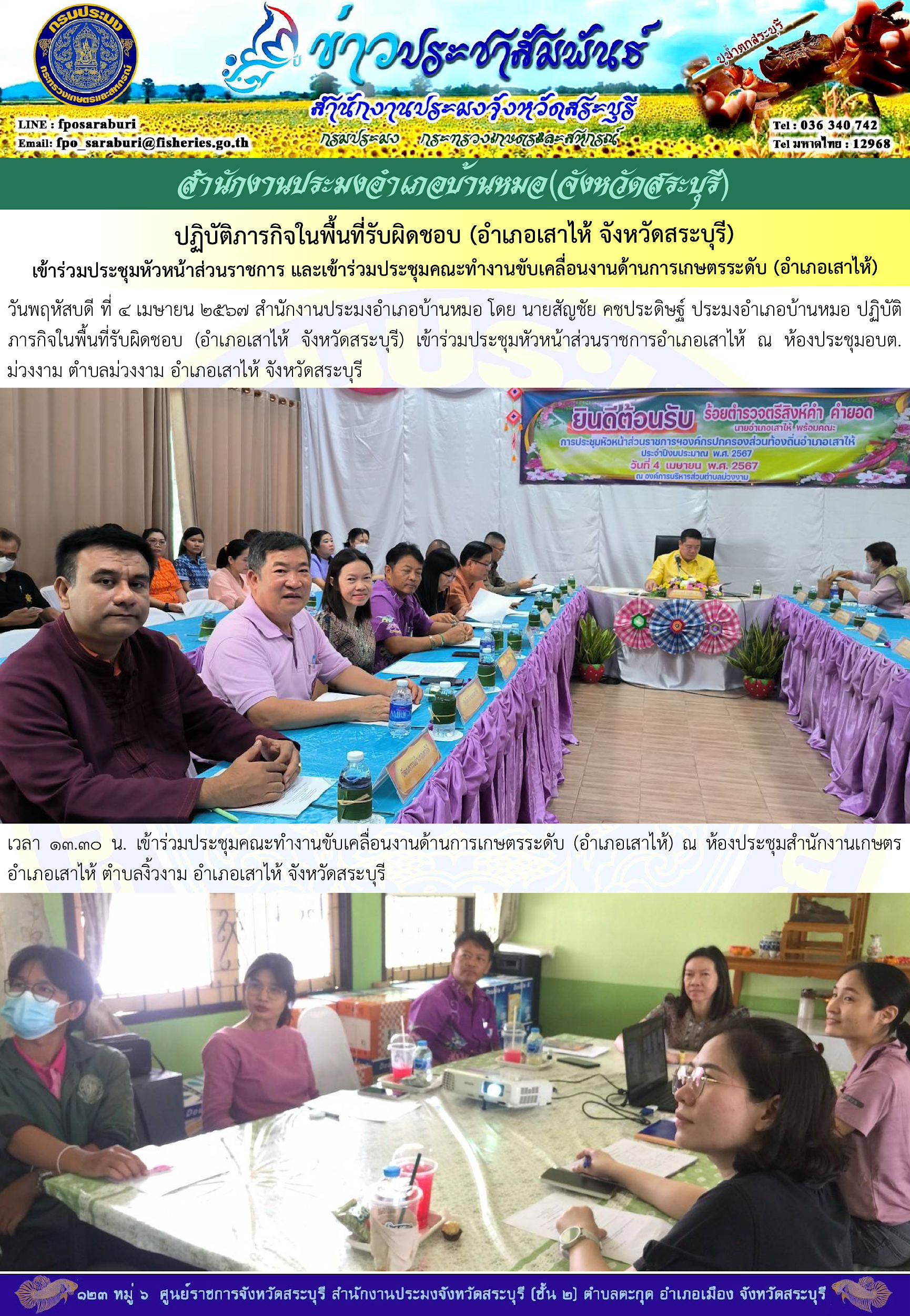 สำนักงานประมงอำเภอบ้านหมอ ปฏิบัติภารกิจในพื้นที่รับผิดชอบ (อำเภอเสาไห้ จังหวัดสระบุรี) เข้าร่วมประชุมหัวหน้าส่วนราชการ และเข้าร่วมประชุมคณะทำงานขับเคลื่อนงานด้านการเกษตรระดับ (อำเภอเสาไห้)