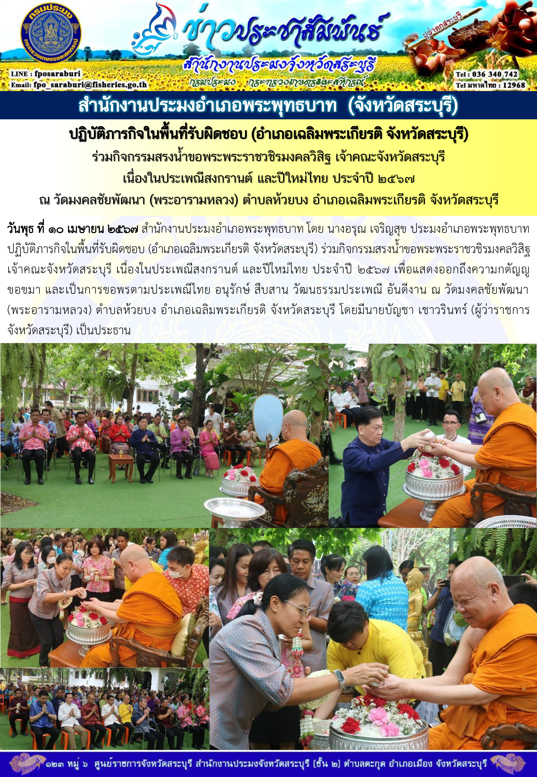 สำนักงานประมงอำเภอพระพุทธบาท ปฏิบัติภารกิจในพื้นที่รับผิดชอบ (อำเภอเฉลิมพระเกียรติ จังหวัดสระบุรี) ร่วมกิจกรรมสรงน้ำขอพระพระราชวชิรมงคลวิสิฐ เจ้าคณะจังหวัดสระบุรี เนื่องในประเพณีสงกรานต์ และปีใหม่ไทย ประจำปี 2567 ณ วัดมงคลชัยพัฒนา (พระอารามหลวง) ตำบลห้วยบง อำเภอเฉลิมพระเกียรติ จังหวัดสระบุรี