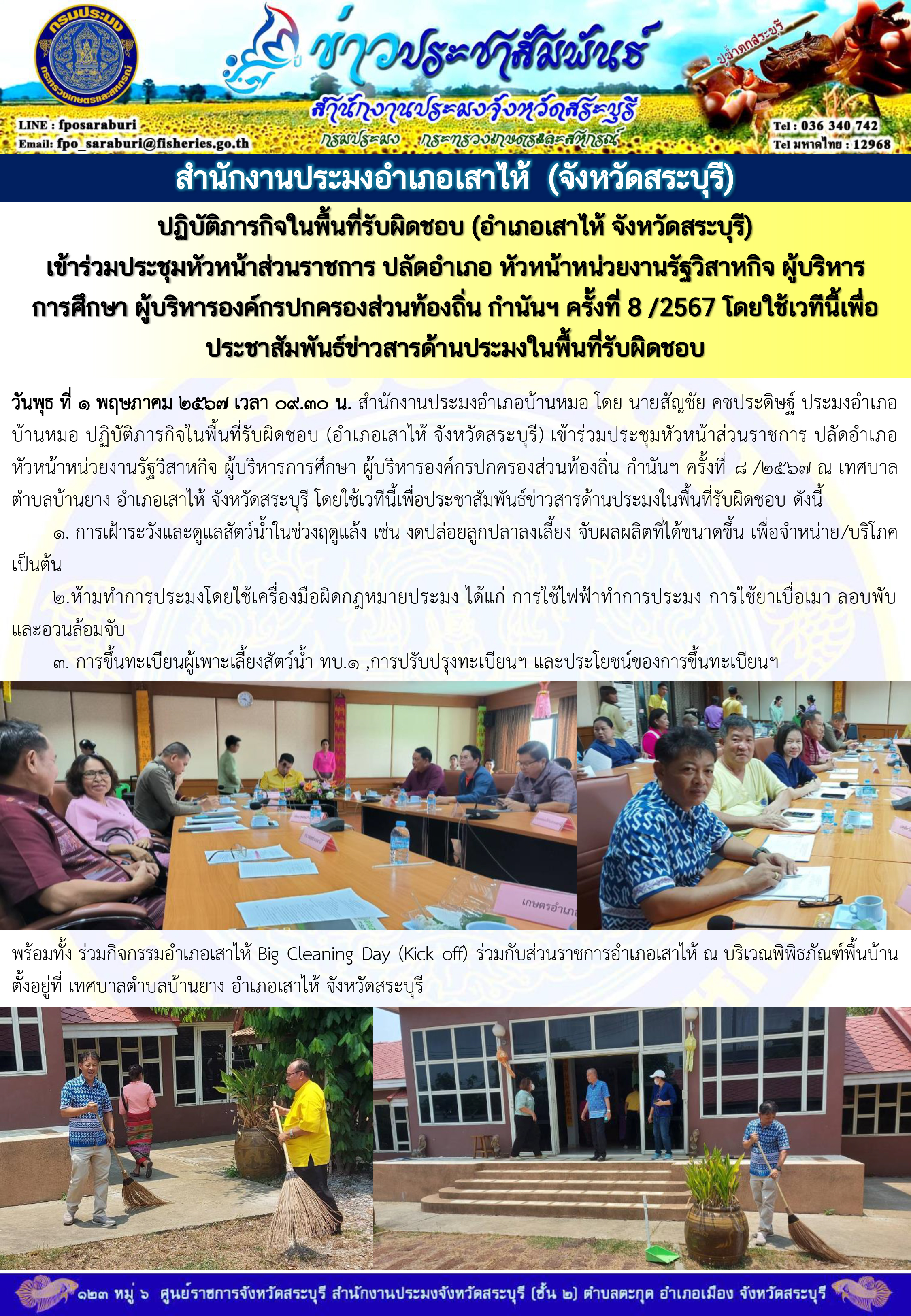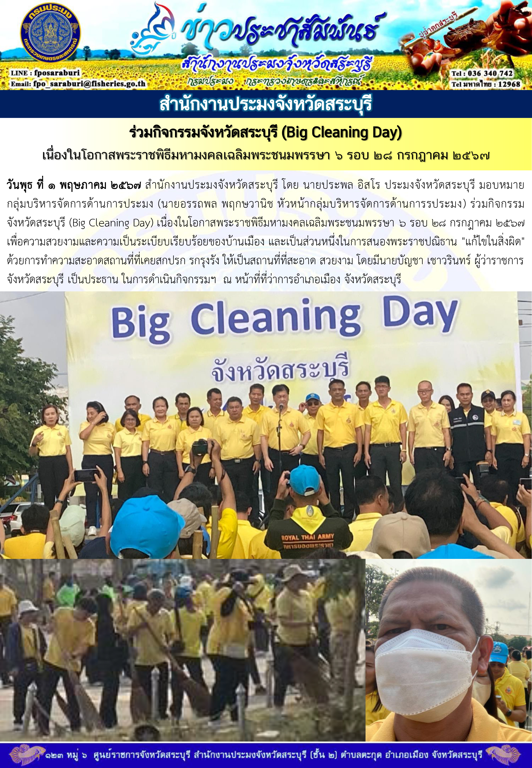 วันพุธ ที่ 1 พฤษภาคม 2567 สำนักงานประมงจังหวัดสระบุรี โดย นายประพล อิสโร ประมงจังหวัดสระบุรี มอบหมายกลุ่มบริหารจัดการด้านการประมง (นายอรรถพล พฤกษวานิช หัวหน้ากลุ่มบริหารจัดการด้านการรประมง) ร่วมกิจกรรมจังหวัดสระบุรี (Big Cleaning Day) เนื่องในโอกาสพระราชพิธีมหามงคลเฉลิมพระชนมพรรษา 6 รอบ 28 กรกฎาคม 2567 เพื่อความสวยงามและความเป็นระเบียบเรียบร้อยของบ้านเมือง และเป็นส่วนหนึ่งในการสนองพระราชปณิธาน "แก้ไขในสิ่งผิด" ด้วยการทำความสะอาดสถานที่ที่เคยสกปรก รกรุงรัง ให้เป็นสถานที่ที่สะอาด สวยงาม โดยมีนายบัญชา เชาวรินทร์ ผู้ว่าราชการจังหวัดสระบุรี เป็นประธาน ในการดำเนินกิจกรรมฯ  ณ หน้าที่ที่ว่าการอำเภอเมือง จังหวัดสระบุรี