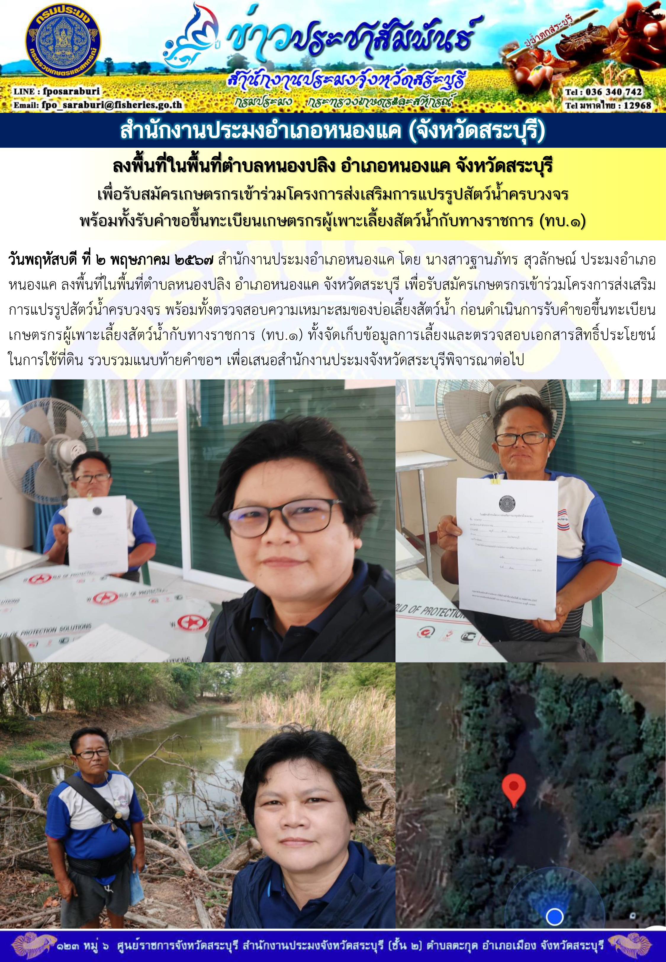 วันพฤหัสบดี ที่ 2 พฤษภาคม 2567 สำนักงานประมงอำเภอหนองแค โดย นางสาวฐานภัทร สุวลักษณ์ ประมงอำเภอหนองแค ลงพื้นที่ในพื้นที่ตำบลหนองปลิง อำเภอหนองแค จังหวัดสระบุรี เพื่อรับสมัครเกษตรกรเข้าร่วมโครงการส่งเสริมการแปรรูปสัตว์น้ำครบวงจร พร้อมทั้งตรวจสอบความเหมาะสมของบ่อเลี้ยงสัตว์น้ำ ก่อนดำเนินการรับคำขอขึ้นทะเบียนเกษตรกรผู้เพาะเลี้ยงสัตว์น้ำกับทางราชการ (ทบ.1) ทั้งจัดเก็บข้อมูลการเลี้ยงและตรวจสอบเอกสารสิทธิ์ประโยชน์ในการใช้ที่ดิน รวบรวมแนบท้ายคำขอฯ เพื่อเสนอสำนักงานประมงจังหวัดสระบุรีพิจารณาต่อไป