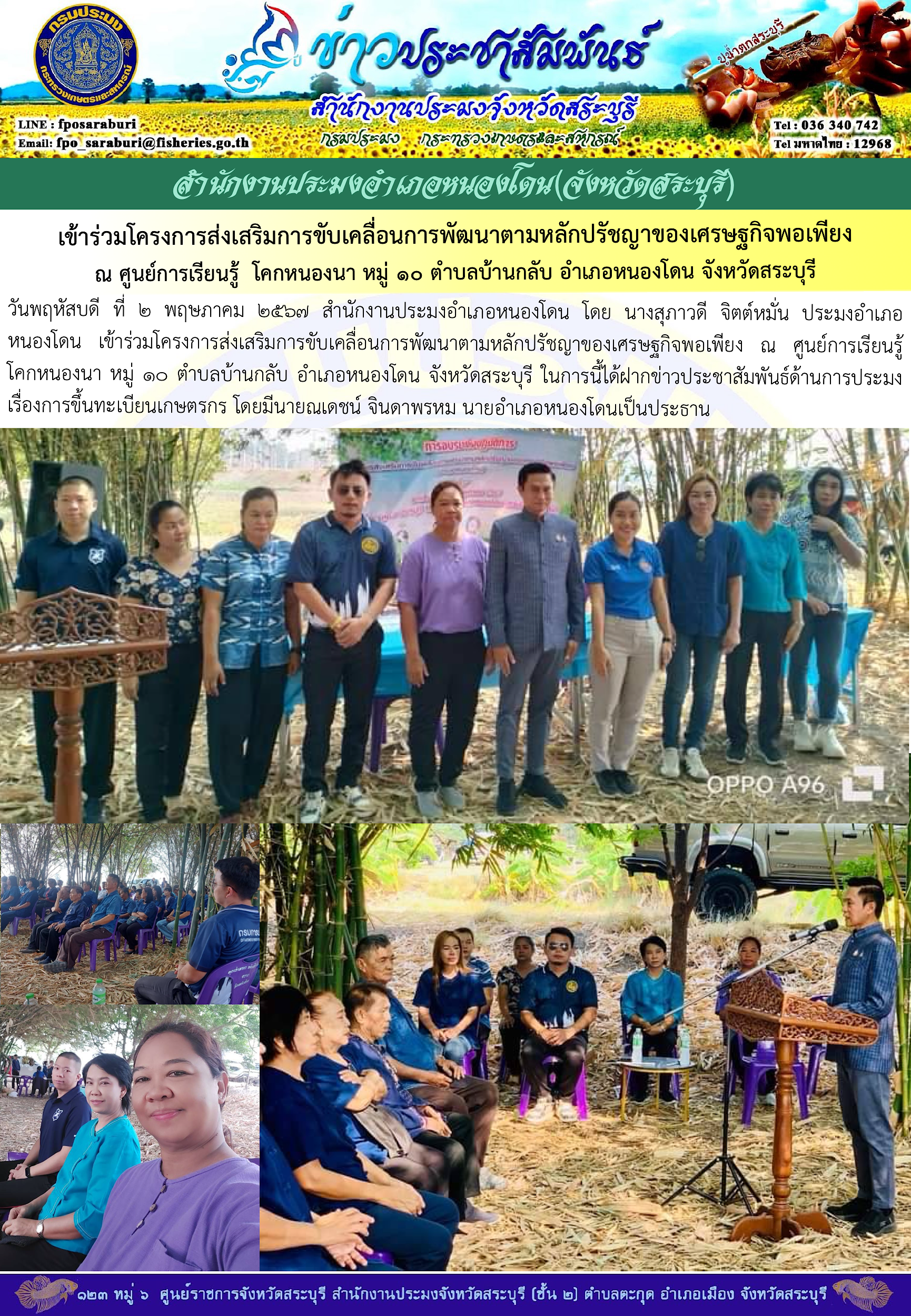 วันพฤหัสบดี ที่ ๒ พฤษภาคม ๒๕๖๗ สำนักงานประมงอำเภอหนองโดน โดย นางสุภาวดี จิตต์หมั่น ประมงอำเภอหนองโดน เข้าร่วมโครงการส่งเสริมการขับเคลื่อนการพัฒนาตามหลักปรัชญาของเศรษฐกิจพอเพียง ณ ศูนย์การเรียนรู้  โคกหนองนา หมู่ ๑๐ ตำบลบ้านกลับ อำเภอหนองโดน จังหวัดสระบุรี ในการนี้ได้ฝากข่าวประชาสัมพันธ์ด้านการประมงเรื่องการขึ้นทะเบียนเกษตรกร โดยมีนายณเดชน์ จินดาพรหม นายอำเภอหนองโดน เป็นประธาน