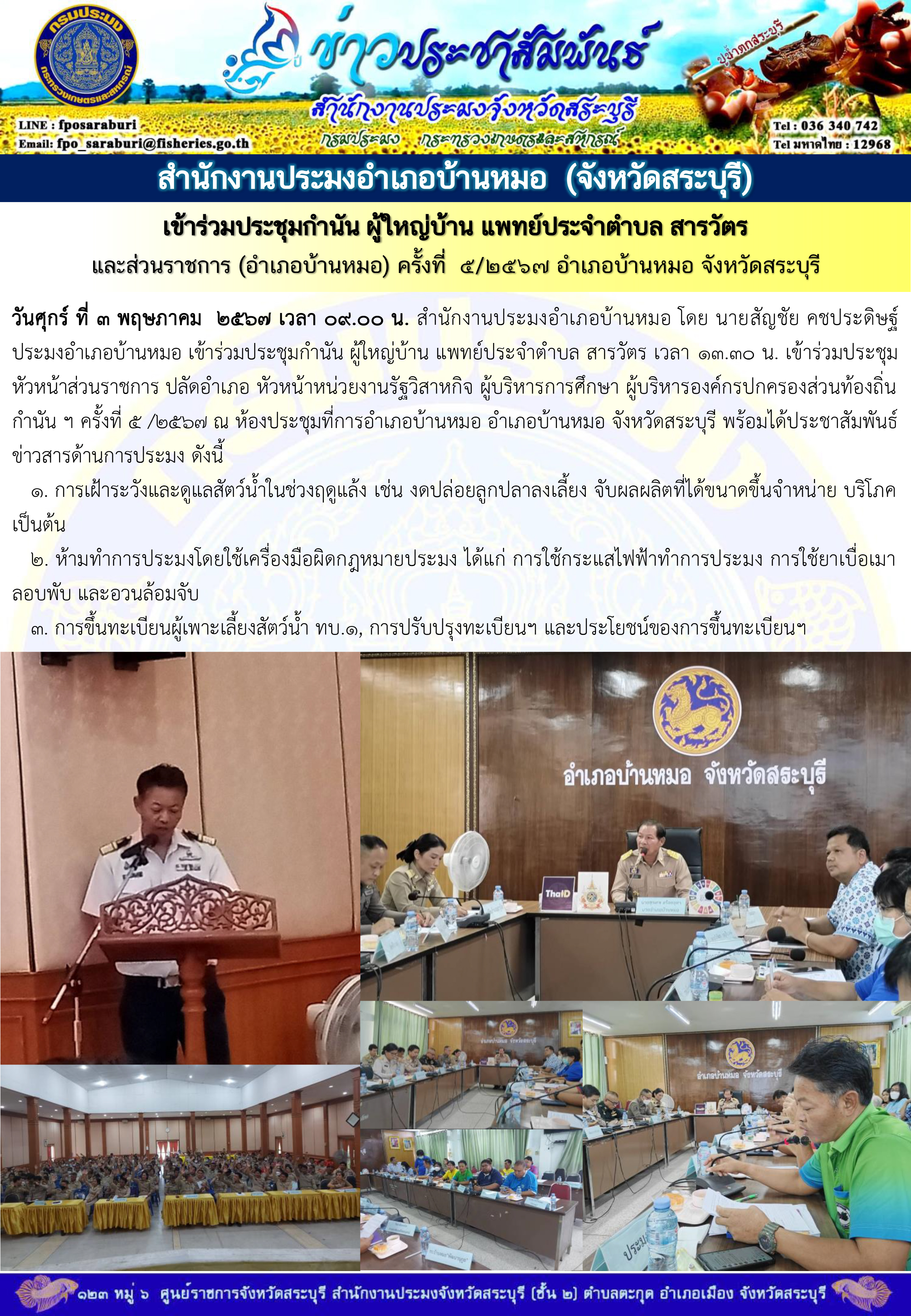 สำนักงานประมงอำเภอหนองแค เข้าร่วมประชุมกำนัน ผู้ใหญ่บ้านฯลฯ ครั้งที่ 5/2567 อำเภอหนองแค จังหวัดสระบุรี