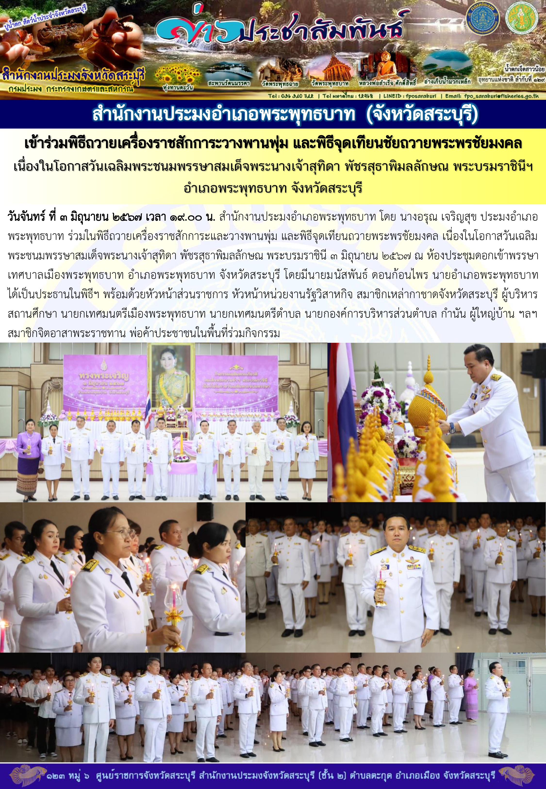 วันจันทร์ ที่ 3 มิถุนายน 2567 เวลา 19.00 น. สำนักงานประมงอำเภอพระพุทธบาท โดย นางอรุณ เจริญสุข  ประมงอำเภอพระพุทธบาท ร่วมในพิธีถวายเครื่องราชสักการะและวางพานพุ่ม และพิธีจุดเทียนถวายพระพรชัยมงคล เนื่องในโอกาสวันเฉลิมพระชนมพรรษาสมเด็จพระนางเจ้าสุทิดา พัชรสุธาพิมลลักษณ พระบรมราชินี 3 มิถุนายน 2567 ณ ห้องประชุมดอกเข้าพรรษา เทศบาลเมืองพระพุทธบาท อำเภอพระพุทธบาท จังหวัดสระบุรี โดยมีนายมนัสพันธ์ ดอนก้อนไพร นายอำเภอพระพุทธบาท ได้เป็นประธานในพิธีฯ พร้อมด้วยหัวหน้าส่วนราชการ หัวหน้าหน่วยงานรัฐวิสาหกิจ สมาชิกเหล่ากาชาดจังหวัดสระบุรี ผู้บริหารสถานศึกษา นายกเทศมนตรีเมืองพระพุทธบาท นายกเทศมนตรีตำบล นายกองค์การบริหารส่วนตำบล กำนัน ผู้ใหญ่บ้าน ฯลฯ สมาชิกจิตอาสาพระราชทาน พ่อค้าประชาชนในพื้นที่ร่วมกิจกรรม