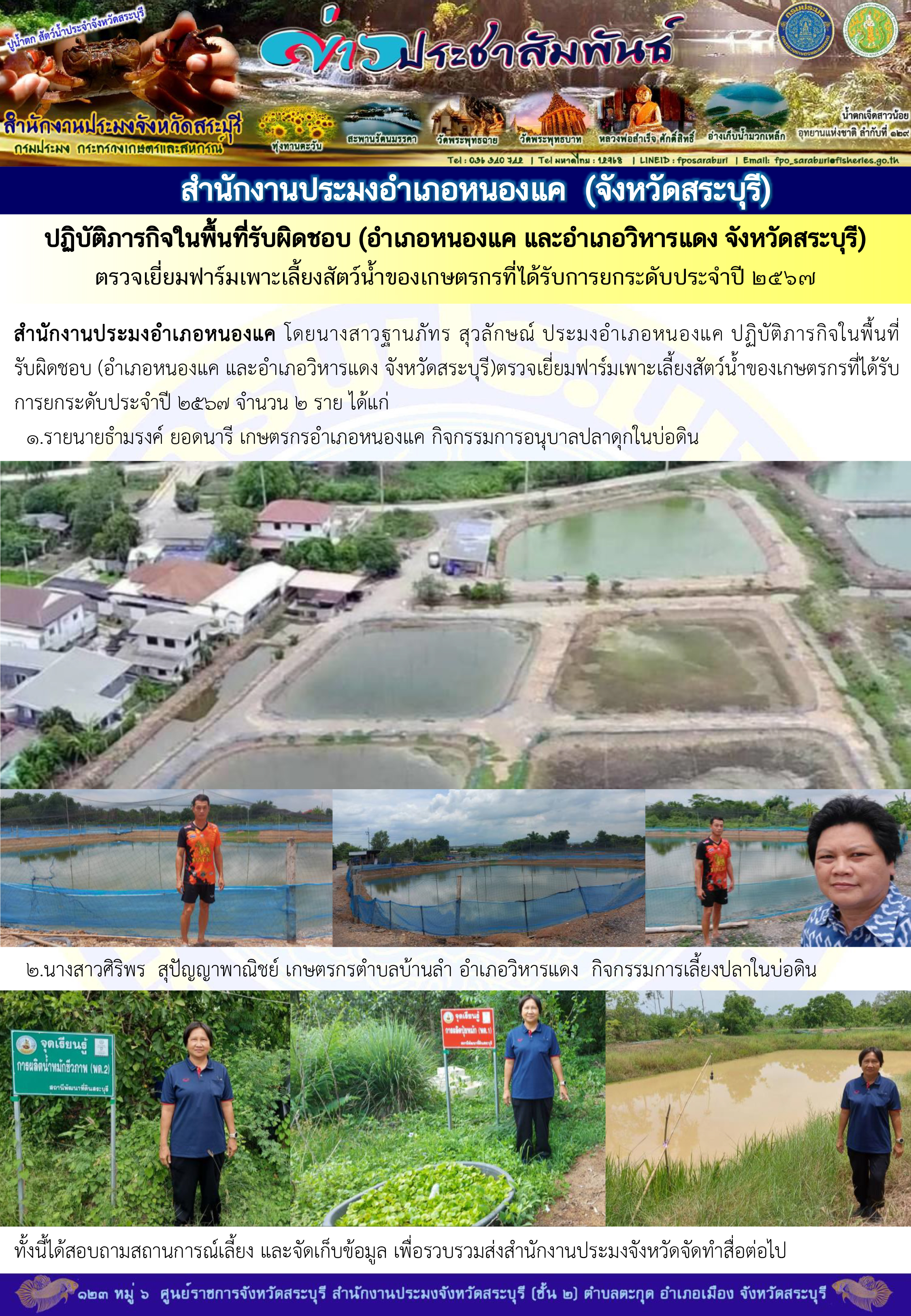 สำนักงานประมงอำเภอหนองแค ปฏิบัติภารกิจในพื้นที่รับผิดชอบ (อำเภอหนองแค และอำเภอวิหารแดง จังหวัดสระบุรี)ตรวจเยี่ยมฟาร์มเพาะเลี้ยงสัตว์น้ำของเกษตรกรที่ได้รับการยกระดับประจำปี 2567