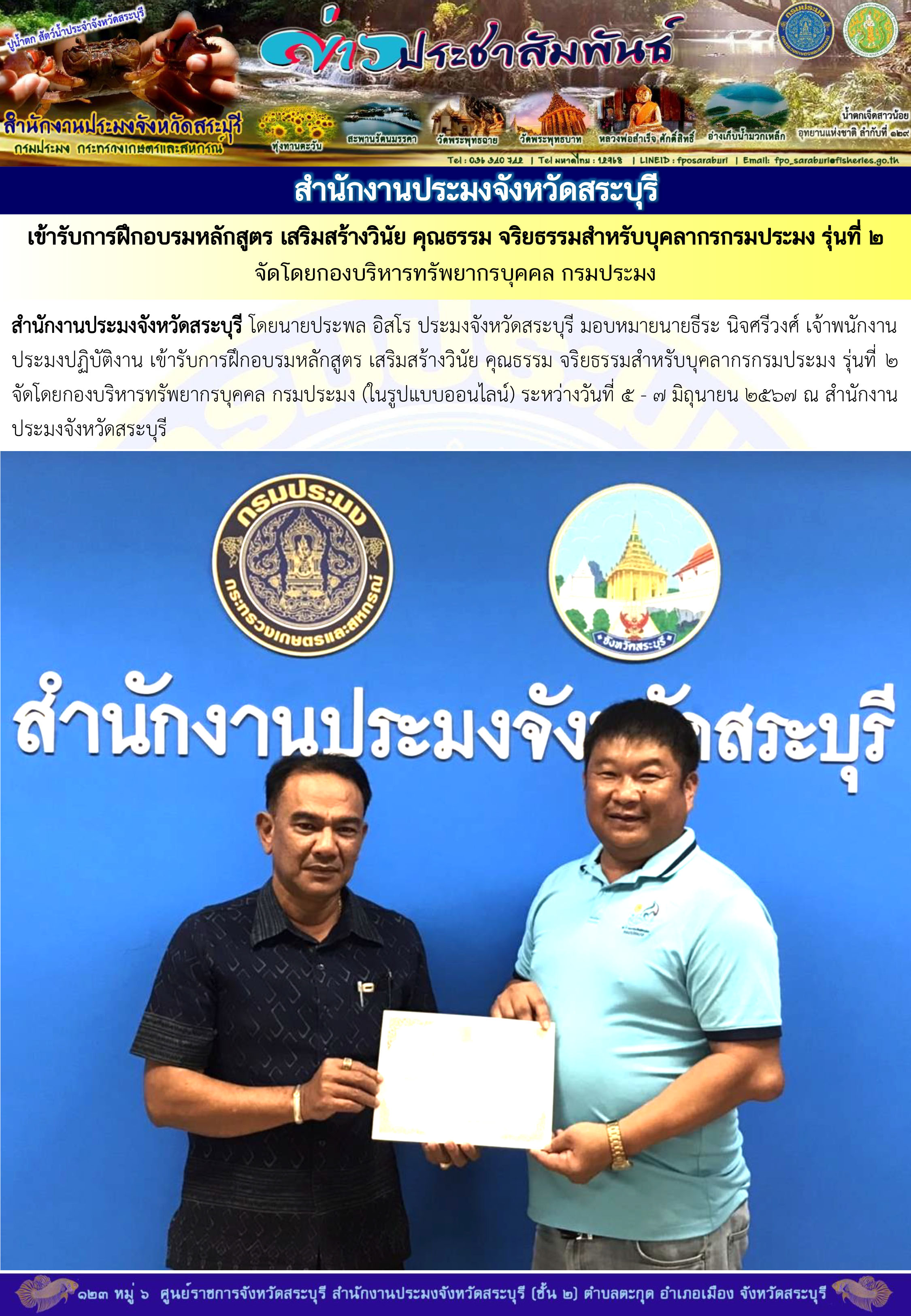 สำนักงานประมงจังหวัดสระบุรี เข้ารับการฝึกอบรมหลักสูตร เสริมสร้างวินัย คุณธรรม จริยธรรมสำหรับบุคลากรกรมประมง รุ่นที่ 2 จัดโดยกองบริหารทรัพยากรบุคคล กรมประมง