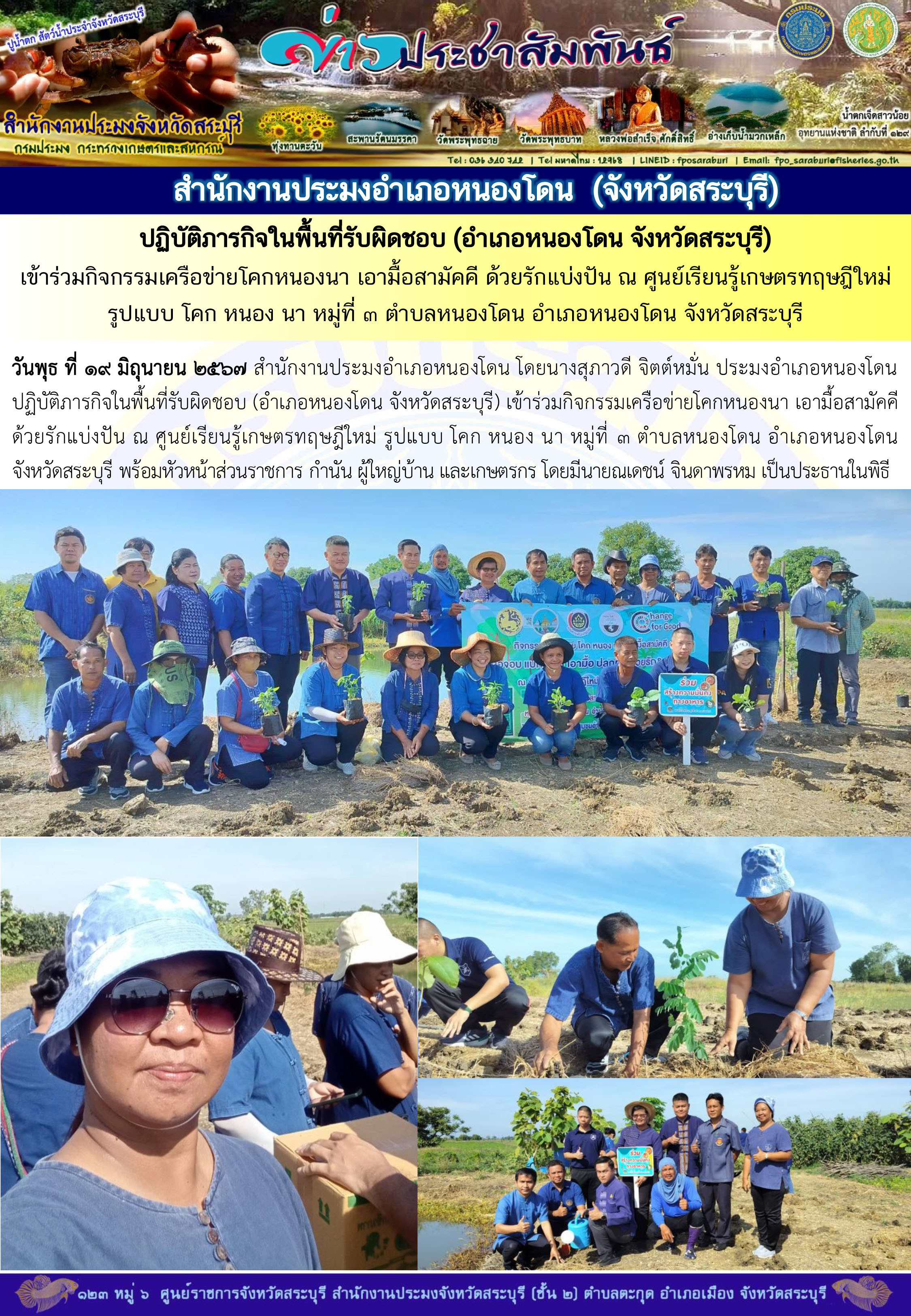 สำนักงานประมงอำเภอหนองโดน ปฏิบัติภารกิจในพื้นที่รับผิดชอบ (อำเภอหนองโดน จังหวัดสระบุรี) เข้าร่วมกิจกรรมเครือข่ายโคกหนองนา เอามื้อสามัคคี ด้วยรักแบ่งปัน ณ ศูนย์เรียนรู้เกษตรทฤษฎีใหม่ รูปแบบ โคก หนอง นา หมู่ที่ 3 ตำบลหนองโดน อำเภอหนองโดน จังหวัดสระบุรี