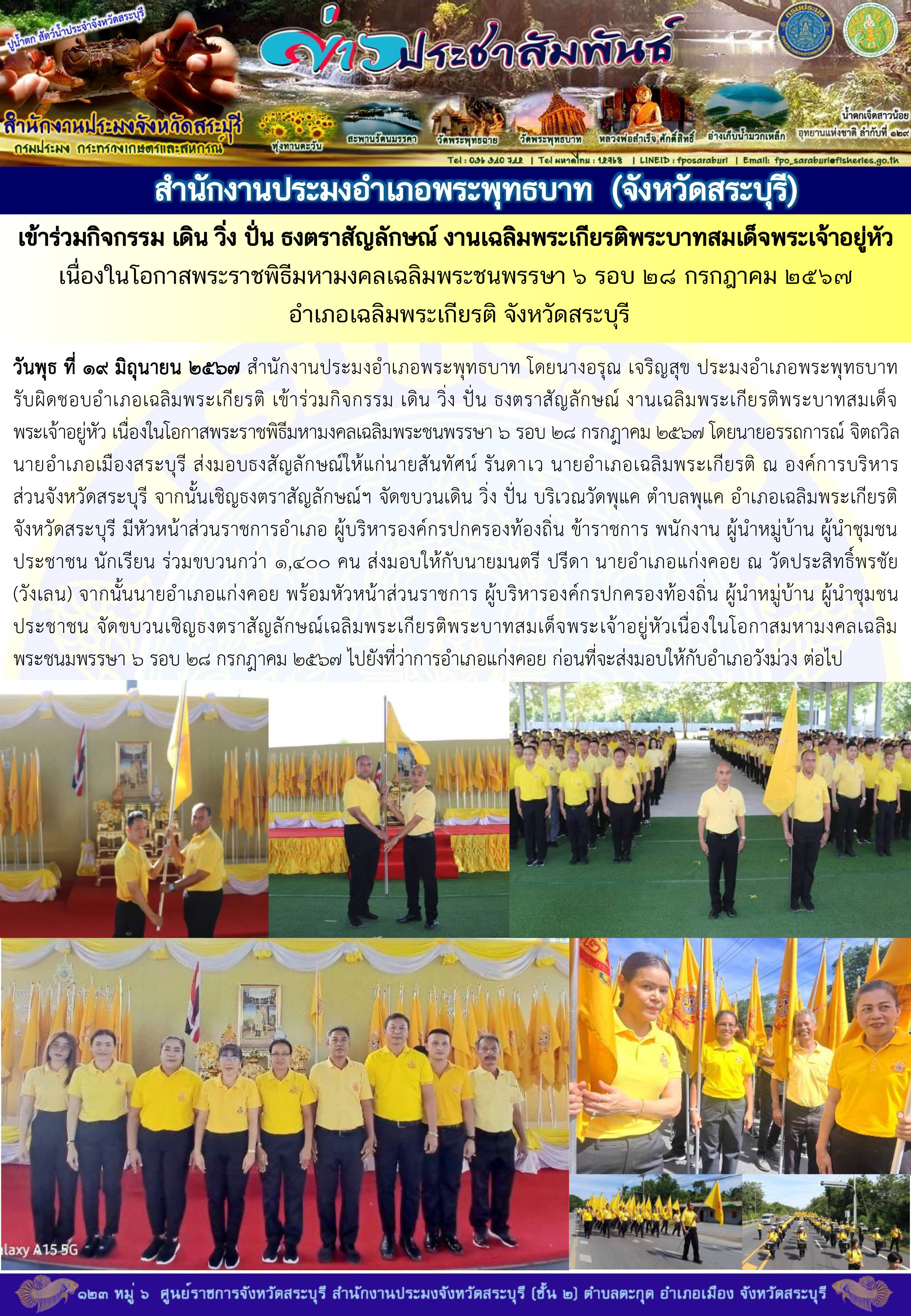 วันพุธ ที่ 19 มิถุนายน 2567 สำนักงานประมงอำเภอพระพุทธบาท โดยนางอรุณ เจริญสุข ประมงอำเภอพระพุทธบาท รับผิดชอบอำเภอเฉลิมพระเกียรติ เข้าร่วมกิจกรรม เดิน วิ่ง ปั่น ธงตราสัญลักษณ์ งานเฉลิมพระเกียรติพระบาทสมเด็จพระเจ้าอยู่หัว เนื่องในโอกาสพระราชพิธีมหามงคลเฉลิมพระชนพรรษา 6 รอบ 28 กรกฎาคม 2567 โดย  นายอรรถการณ์  จิตถวิล นายอำเภอเมืองสระบุรี ส่งมอบธงสัญลักษณ์ให้แก่นายสันทัศน์ รันดาเว นายอำเภอเฉลิมพระเกียรติ ณ องค์การบริหารส่วนจังหวัดสระบุรี จากนั้นเชิญธงตราสัญลักษณ์ฯ จัดขบวนเดิน วิ่ง ปั่น บริเวณวัดพุแค ตำบลพุแค อำเภอเฉลิมพระเกียรติ จังหวัดสระบุรี มีหัวหน้าส่วนราชการอำเภอ ผู้บริหารองค์กรปกครองท้องถิ่น ข้าราชการ พนักงาน ผู้นำหมู่บ้าน ผู้นำชุมชน ประชาชน นักเรียน ร่วมขบวนกว่า 1,400 คน ส่งมอบให้กับนายมนตรี ปรีดา นายอำเภอแก่งคอย ณ วัดประสิทธิ์พรชัย (วังเลน) จากนั้นนายอำเภอแก่งคอย พร้อมหัวหน้าส่วนราชการ ผู้บริหารองค์กรปกครองท้องถิ่น ผู้นำหมู่บ้าน ผู้นำชุมชน ประชาชน จัดขบวนเชิญธงตราสัญลักษณ์เฉลิมพระเกียรติพระบาทสมเด็จพระเจ้าอยู่หัวเนื่องในโอกาสมหามงคลเฉลิมพระชนมพรรษา 6 รอบ 28 กรกฎาคม 2567 ไปยังที่ว่าการอำเภอแก่งคอย ก่อนที่จะส่งมอบให้กับอำเภอวังม่วง ต่อไป