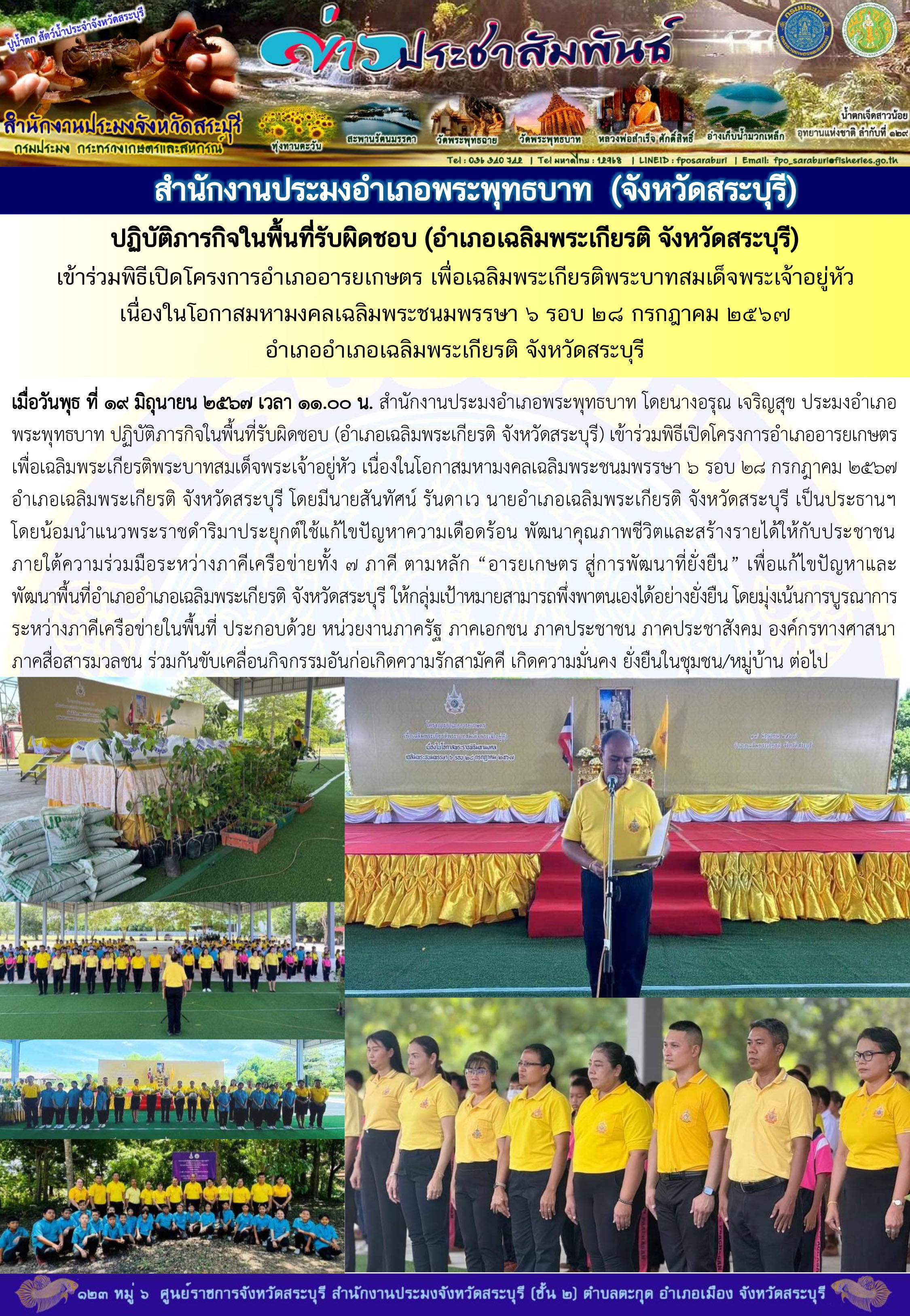 สำนักงานประมงอำเภอพระพุทธบาท ปฏิบัติภารกิจในพื้นที่รับผิดชอบ (อำเภอเฉลิมพระเกียรติ จังหวัดสระบุรี) เข้าร่วมพิธีเปิดโครงการอำเภออารยเกษตร เพื่อเฉลิมพระเกียรติพระบาทสมเด็จพระเจ้าอยู่หัว เนื่องในโอกาสมหามงคลเฉลิมพระชนมพรรษา 6 รอบ 28 กรกฎาคม 2567 อำเภออำเภอเฉลิมพระเกียรติ จังหวัดสระบุรี