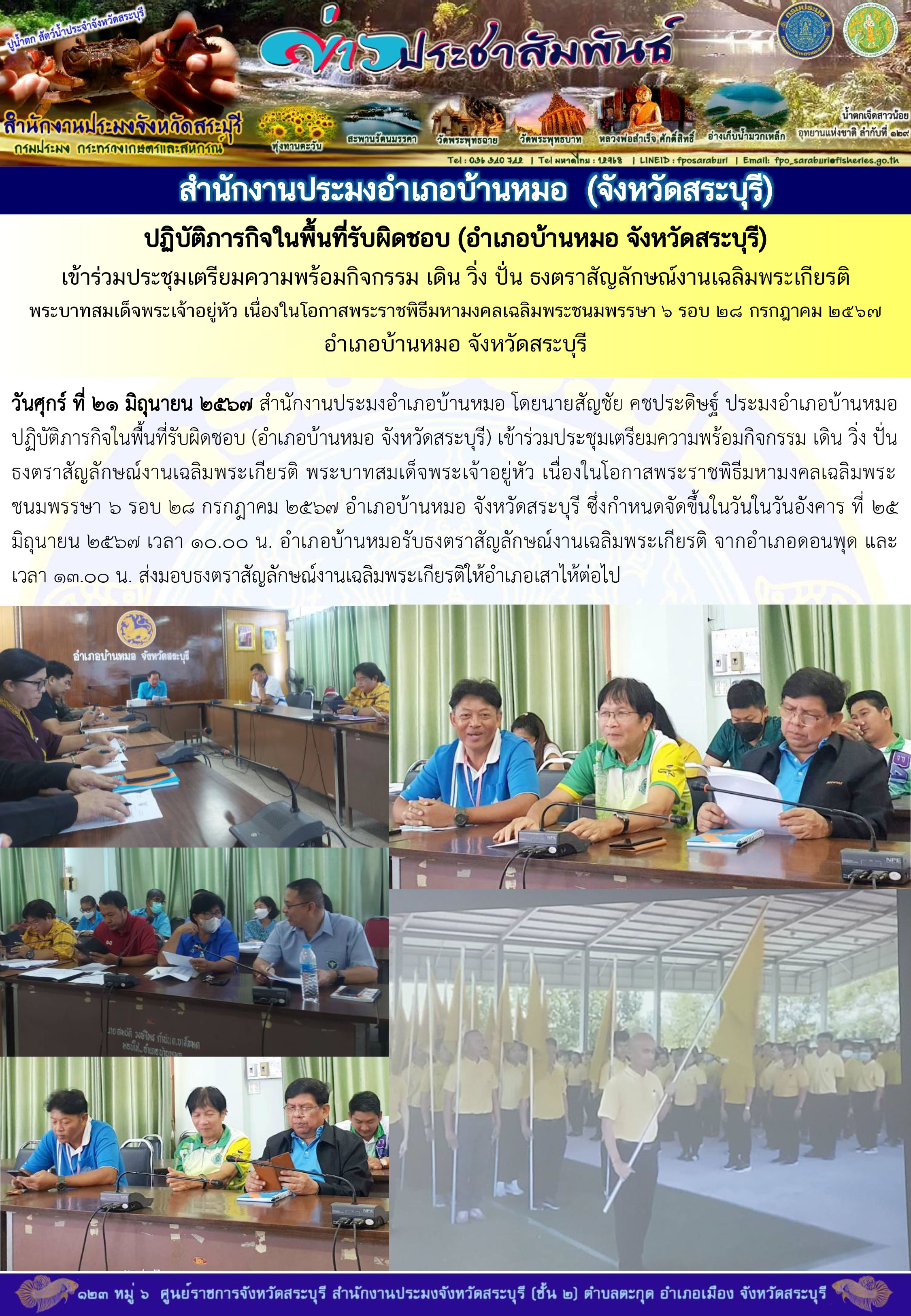 วันศุกร์ ที่ 21 มิถุนายน 2567 สำนักงานประมงอำเภอบ้านหมอ โดยนายสัญชัย คชประดิษฐ์ ประมงอำเภอบ้านหมอ ปฏิบัติภารกิจในพื้นที่รับผิดชอบ (อำเภอบ้านหมอ จังหวัดสระบุรี) เข้าร่วมประชุมเตรียมความพร้อมกิจกรรม เดิน วิ่ง ปั่น ธงตราสัญลักษณ์งานเฉลิมพระเกียรติ พระบาทสมเด็จพระเจ้าอยู่หัว เนื่องในโอกาสพระราชพิธีมหามงคลเฉลิมพระชนมพรรษา 6 รอบ 28 กรกฎาคม 2567 อำเภอบ้านหมอ จังหวัดสระบุรี ซึ่งกำหนดจัดขึ้นในวันในวันอังคาร ที่ 25 มิถุนายน 2567 เวลา 10.00 น. อำเภอบ้านหมอรับธงตราสัญลักษณ์งานเฉลิมพระเกียรติ จากอำเภอดอนพุด และเวลา 13.00 น. ส่งมอบธงตราสัญลักษณ์งานเฉลิมพระเกียรติให้อำเภอเสาไห้ต่อไป