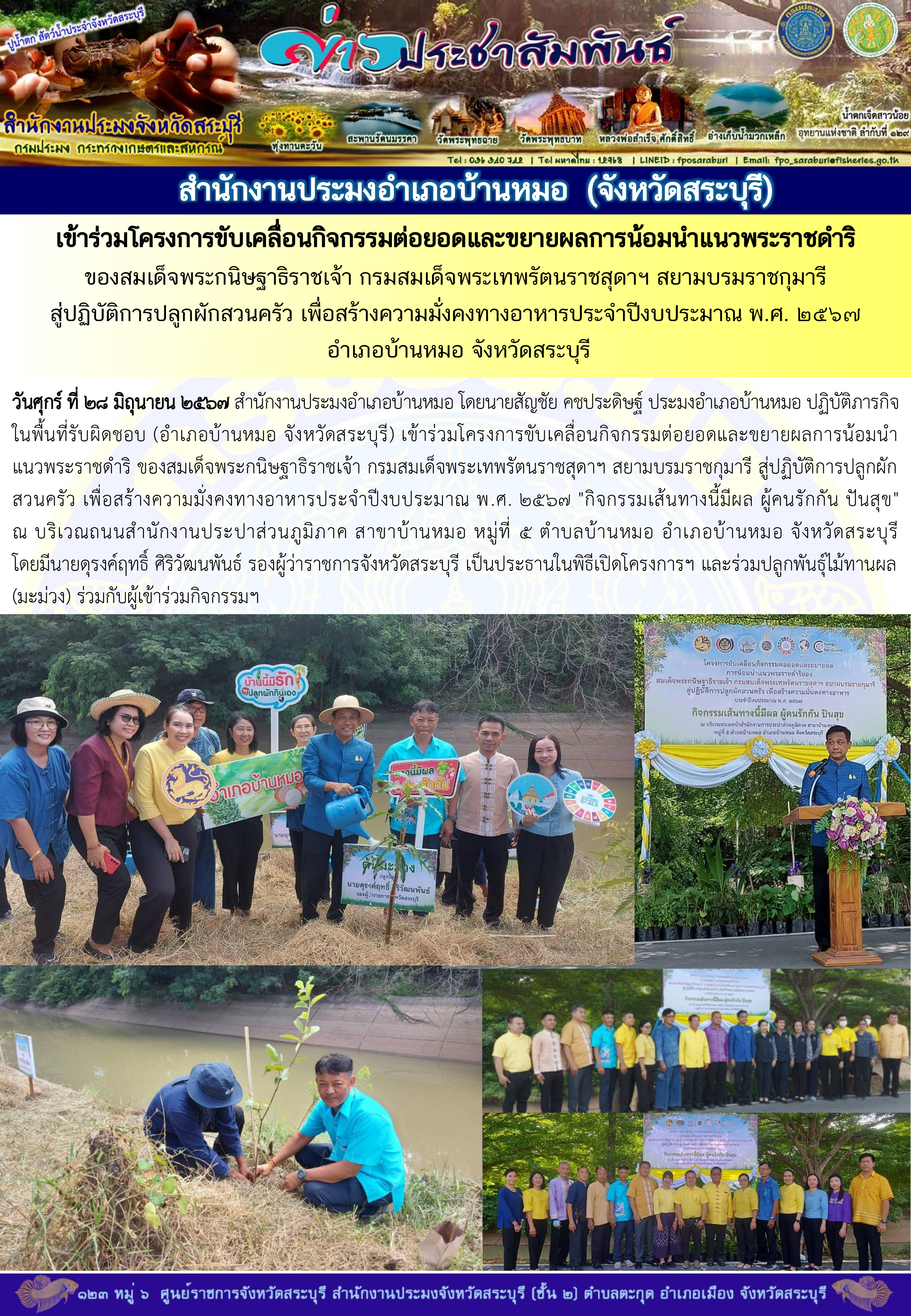 วันศุกร์ ที่ 28 มิถุนายน 2567 สำนักงานประมงอำเภอบ้านหมอ โดยนายสัญชัย คชประดิษฐ์ ประมงอำเภอบ้านหมอ ปฏิบัติภารกิจในพื้นที่รับผิดชอบ (อำเภอบ้านหมอ จังหวัดสระบุรี) เข้าร่วมโครงการขับเคลื่อนกิจกรรมต่อยอดและขยายผลการน้อมนำแนวพระราชดำริ ของสมเด็จพระกนิษฐาธิราชเจ้า กรมสมเด็จพระเทพรัตนราชสุดาฯ สยามบรมราชกุมารี สู่ปฏิบัติการปลูกผักสวนครัว เพื่อสร้างความมั่งคงทางอาหารประจำปีงบประมาณ พ.ศ. 2567 "กิจกรรมเส้นทางนี้มีผล ผู้คนรักกัน ปันสุข" ณ บริเวณถนนสำนักงานประปาส่วนภูมิภาค สาขาบ้านหมอ หมู่ที่ 5 ตำบลบ้านหมอ อำเภอบ้านหมอ จังหวัดสระบุรี โดยมีนายดุรงค์ฤทธิ์ ศิริวัฒนพันธ์ รองผู้ว่าราชการจังหวัดสระบุรี เป็นประธานในพิธีเปิดโครงการฯ และร่วมปลูกพันธุ์ไม้ทานผล (มะม่วง) ร่วมกับผู้เข้าร่วมกิจกรรมฯ