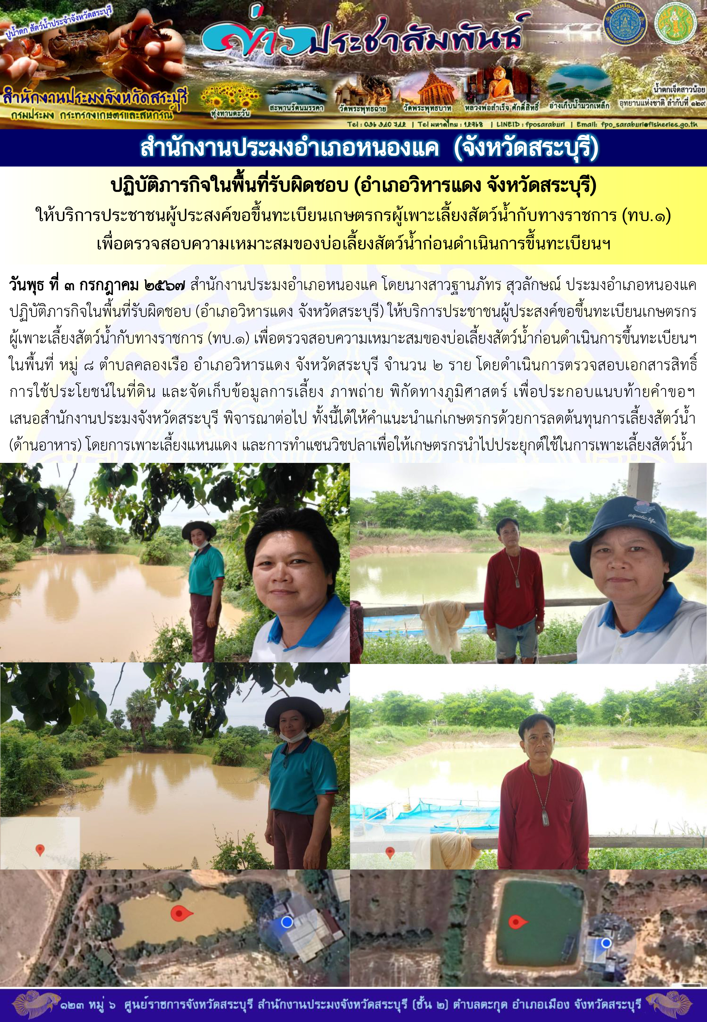 สำนักงานประมงอำเภอหนองแค ปฏิบัติภารกิจในพื้นที่รับผิดชอบ (อำเภอวิหารแดง จังหวัดสระบุรี) ให้บริการประชาชนผู้ประสงค์ขอขึ้นทะเบียนเกษตรกรผู้เพาะเลี้ยงสัตว์น้ำกับทางราชการ (ทบ.1) เพื่อตรวจสอบความเหมาะสมของบ่อเลี้ยงสัตว์น้ำก่อนดำเนินการขึ้นทะเบียนฯ
