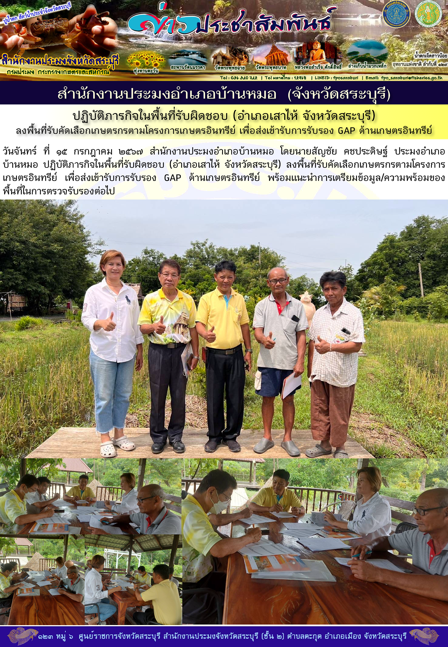 วันจันทร์ ที่ ๑๕ กรกฎาคม ๒๕๖๗ สำนักงานประมงอำเภอบ้านหมอ โดยนายสัญชัย คชประดิษฐ์ ประมงอำเภอบ้านหมอ ปฏิบัติภารกิจในพื้นที่รับผิดชอบ (อำเภอเสาไห้ จังหวัดสระบุรี) ลงพื้นที่รับคัดเลือกเกษตรกรตามโครงการเกษตรอินทรีย์ เพื่อส่งเข้ารับการรับรอง GAP ด้านเกษตรอินทรีย์ พร้อมแนะนำการเตรียมข้อมูล/ความพร้อมของพื้นที่ในการตรวจรับรองต่อไป
