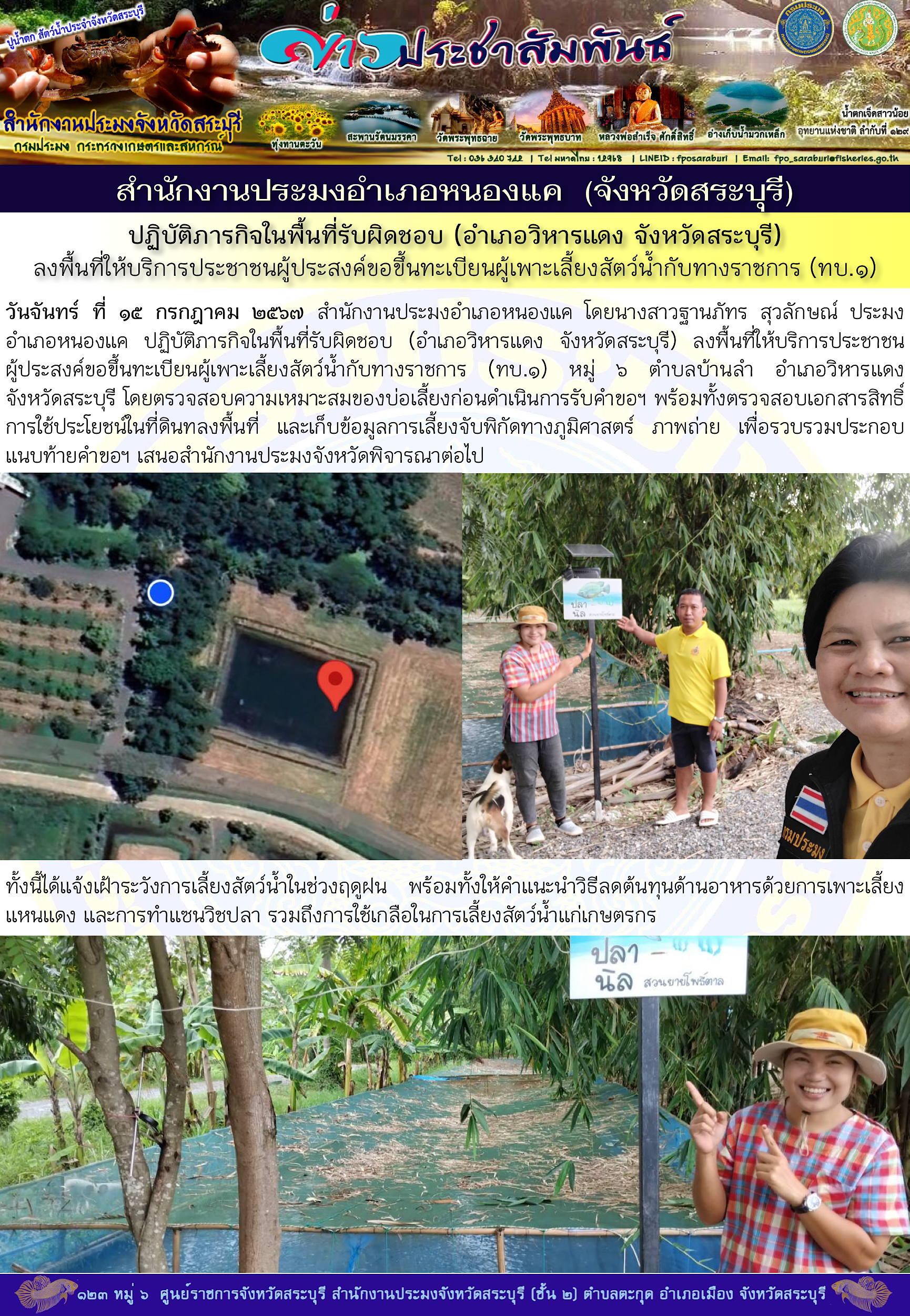 ภารกิจประจำวันที่ 15 กรกฎาคม 2567 สำนักงานประมงจังหวัดสระบุรี
