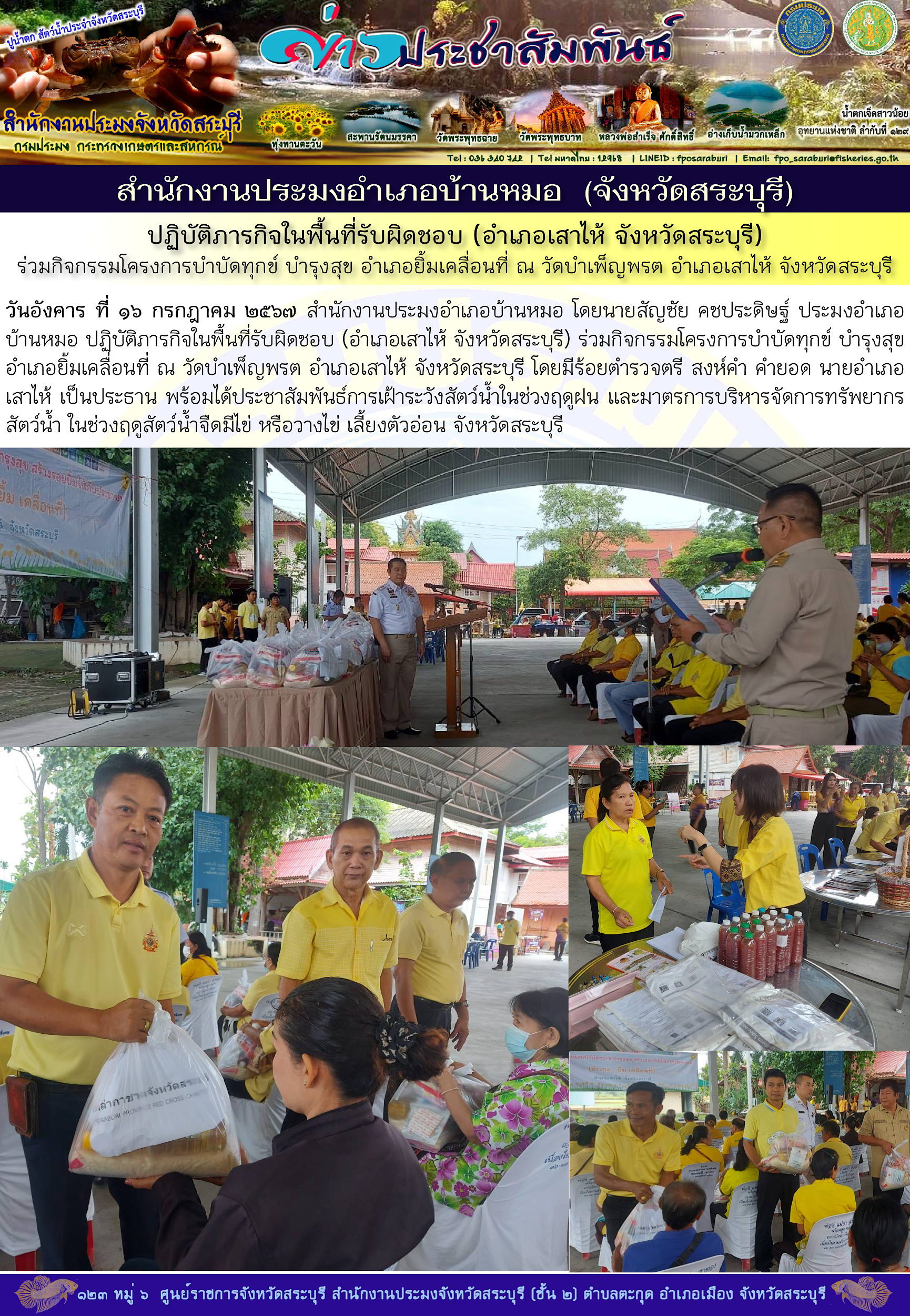 สำนักงานประมงอำเภอบ้านหมอ ปฏิบัติภารกิจในพื้นที่รับผิดชอบ (อำเภอเสาไห้ จังหวัดสระบุรี) ร่วมกิจกรรมโครงการบำบัดทุกข์ บำรุงสุข อำเภอยิ้มเคลื่อนที่ ณ วัดบำเพ็ญพรต อำเภอเสาไห้ จังหวัดสระบุรี