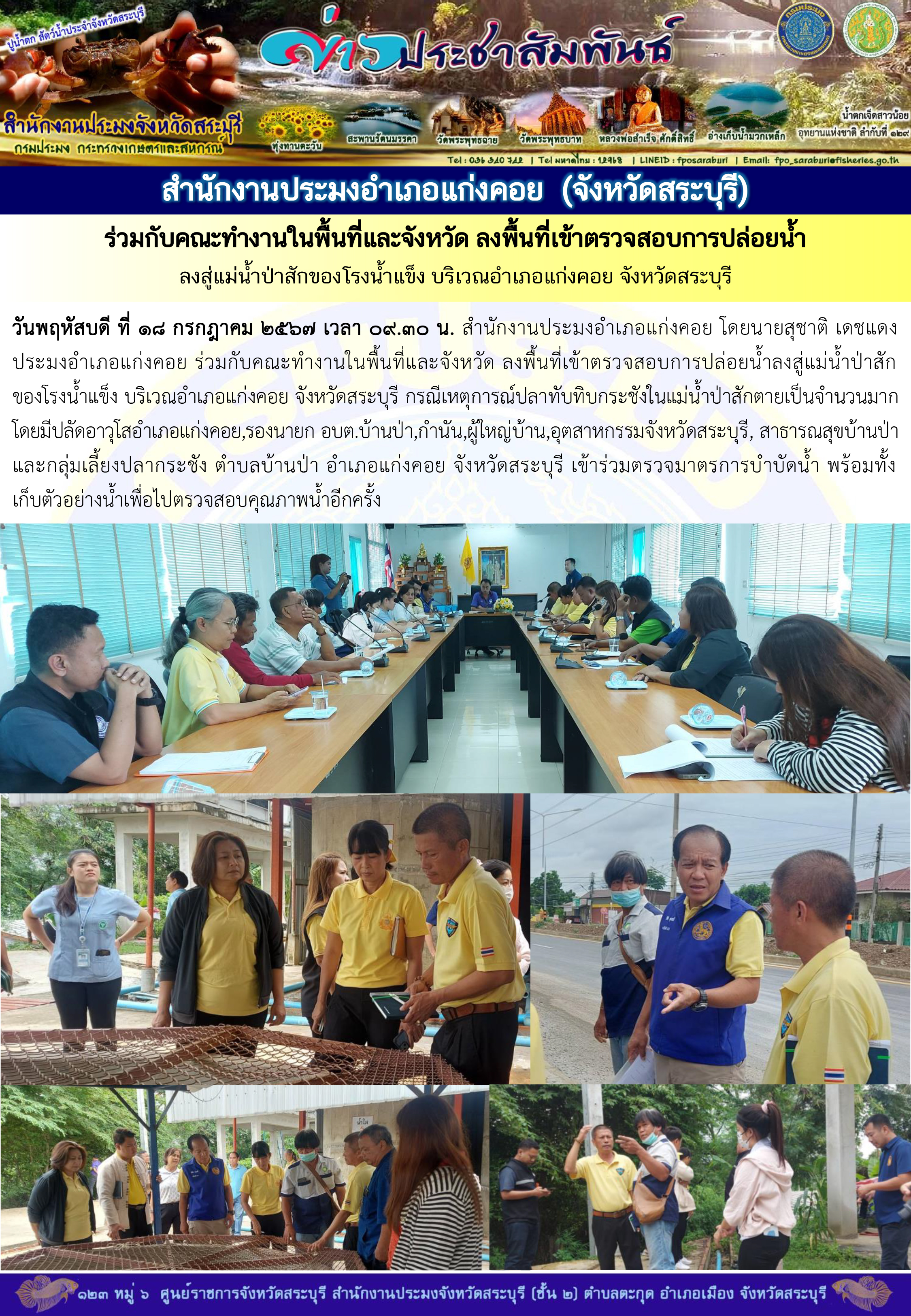วันพฤหัสบดี ที่ 18 กรกฎาคม 2567 เวลา 09.30 น. สำนักงานประมงอำเภอแก่งคอย โดยนายสุชาติ เดชแดง ประมงอำเภอแก่งคอย ร่วมกับคณะทำงานในพื้นที่และจังหวัด ลงพื้นที่เข้าตรวจสอบการปล่อยน้ำลงสู่แม่น้ำป่าสัก ของโรงน้ำแข็ง บริเวณอำเภอแก่งคอย จังหวัดสระบุรี กรณีเหตุการณ์ปลาทับทิบกระชังในแม่น้ำป่าสักตายเป็นจำนวนมาก โดยมีปลัดอาวุโสอำเภอแก่งคอย,รองนายก อบต.บ้านป่า,กำนัน,ผู้ใหญ่บ้าน,อุตสาหกรรมจังหวัดสระบุรี,สาธารณสุขบ้านป่า และกลุ่มเลี้ยงปลากระชัง ตำบลบ้านป่า อำเภอแก่งคอย จังหวัดสระบุรี เข้าร่วมตรวจมาตรการบำบัดน้ำ พร้อมทั้งเก็บตัวอย่างน้ำเพื่อไปตรวจสอบคุณภาพน้ำอีกครั้ง