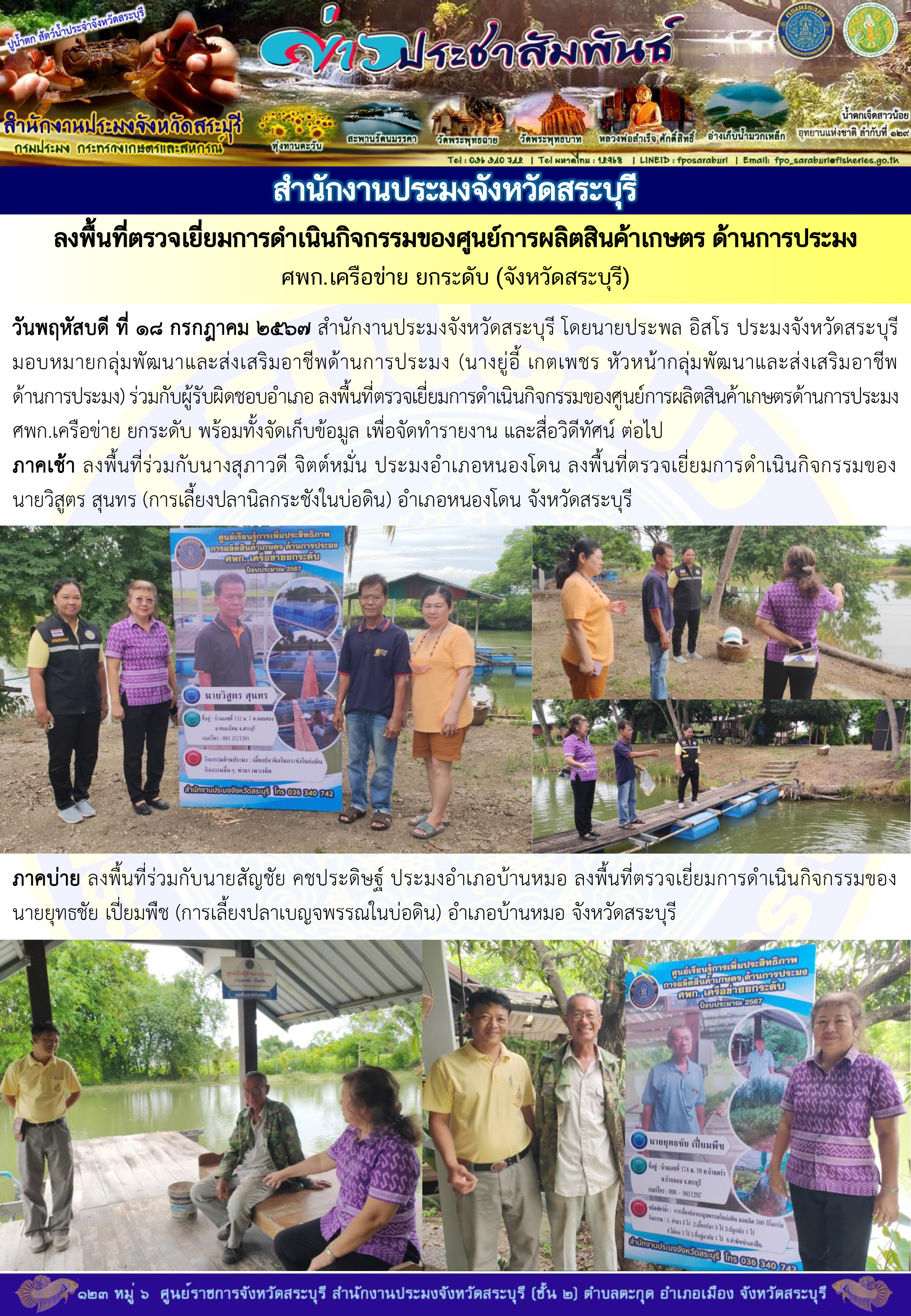วันพฤหัสบดี ที่ ๑๘ กรกฎาคม ๒๕๖๗ สำนักงานประมงจังหวัดสระบุรี โดยนายประพล อิสโร ประมงจังหวัดสระบุรี มอบหมายกลุ่มพัฒนาและส่งเสริมอาชีพด้านการประมง (นางยู่อี้ เกตเพชร หัวหน้ากลุ่มพัฒนาและส่งเสริมอาชีพด้านการประมง) ร่วมกับผู้รับผิดชอบอำเภอ ลงพื้นที่ตรวจเยี่ยมการดำเนินกิจกรรมของศูนย์การผลิตสินค้าเกษตรด้านการประมง ศพก.เครือข่าย ยกระดับ พร้อมทั้งจัดเก็บข้อมูล เพื่อจัดทำรายงาน และสื่อวิดีทัศน์ ต่อไป