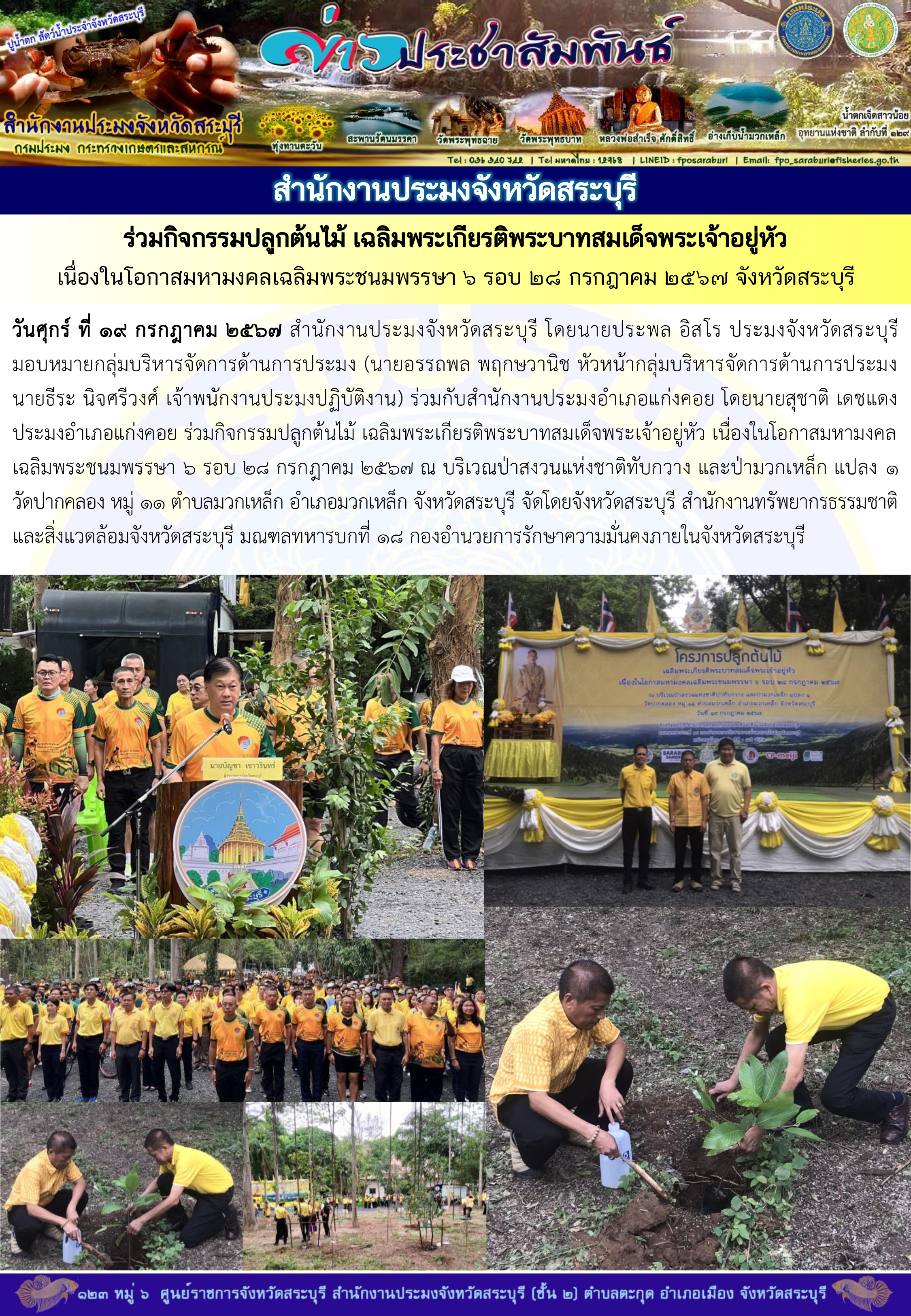 วันศุกร์ ที่ 19 กรกฎาคม 2567 สำนักงานประมงจังหวัดสระบุรี โดยนายประพล อิสโร ประมงจังหวัดสระบุรี มอบหมายกลุ่มบริหารจัดการด้านการประมง (นายอรรถพล พฤกษวานิช หัวหน้ากลุ่มบริหารจัดการด้านการประมง นายธีระ นิจศรีวงศ์ เจ้าพนักงานประมงปฏิบัติงาน) ร่วมกับสำนักงานประมงอำเภอแก่งคอย โดยนายสุชาติ เดชแดง ประมงอำเภอแก่งคอย ร่วมกิจกรรมปลูกต้นไม้ เฉลิมพระเกียรติพระบาทสมเด็จพระเจ้าอยู่หัว เนื่องในโอกาสมหามงคลเฉลิมพระชนมพรรษา 6 รอบ 28 กรกฎาคม 2567 ณ บริเวณป่าสงวนแห่งชาติทับกวาง และป่ามวกเหล็ก แปลง 1 วัดปากคลอง หมู่ 11 ตำบลมวกเหล็ก อำเภอมวกเหล็ก จังหวัดสระบุรี จัดโดยจังหวัดสระบุรี สำนักงานทรัพยากรธรรมชาติและสิ่งแวดล้อมจังหวัดสระบุรี มณฑลทหารบกที่ 18 กองอำนวยการรักษาความมั่นคงภายในจังหวัดสระบุรี