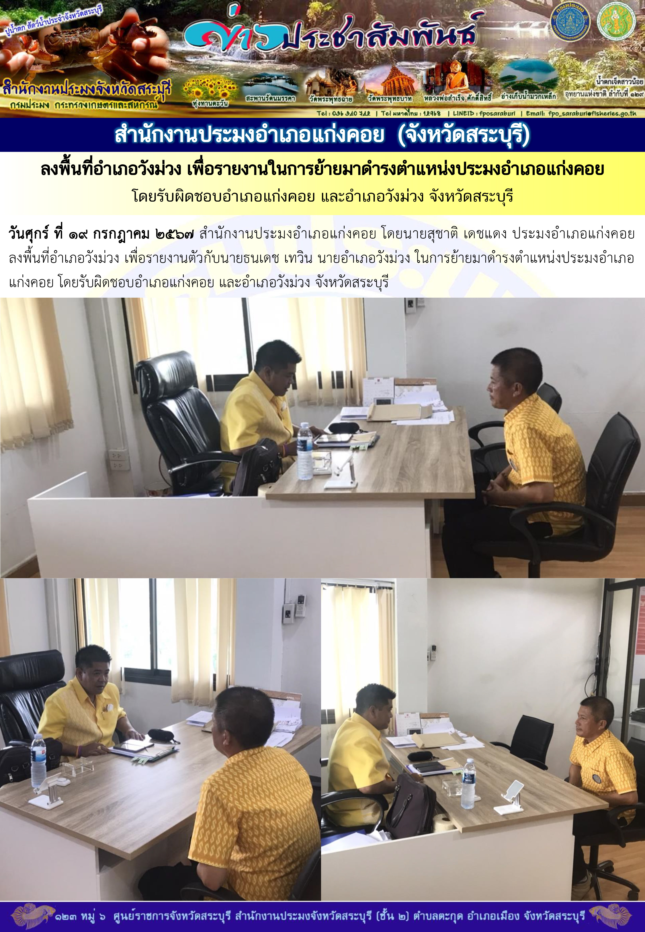 วันศุกร์ ที่ 19 กรกฎาคม 2567 สำนักงานประมงอำเภอแก่งคอย โดยนายสุชาติ เดชแดง ประมงอำเภอแก่งคอย ลงพื้นที่อำเภอวังม่วง เพื่อรายงานตัวกับนายธนเดช เทวิน นายอำเภอวังม่วง ในการย้ายมาดำรงตำแหน่งประมงอำเภอแก่งคอย โดยรับผิดชอบอำเภอแก่งคอย และอำเภอวังม่วง จังหวัดสระบุรี
