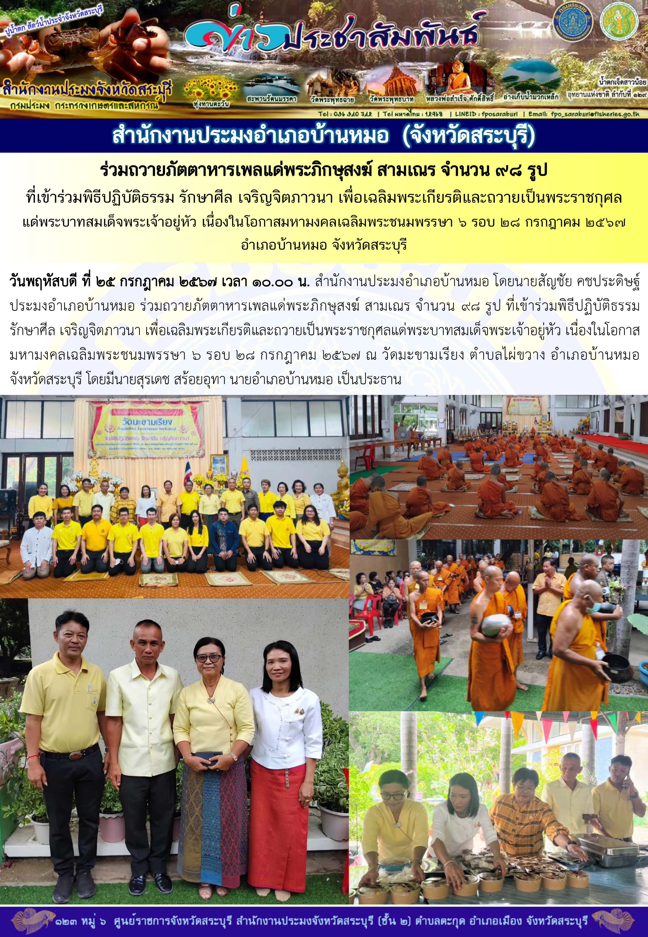สำนักงานประมงอำเภอบ้านหมอ ร่วมถวายภัตตาหารเพลแด่พระภิกษุสงฆ์ สามเณร จำนวน 98 รูป ที่เข้าร่วมพิธีปฏิบัติธรรม รักษาศีล เจริญจิตภาวนา เพื่อเฉลิมพระเกียรติและถวายเป็นพระราชกุศลแด่พระบาทสมเด็จพระเจ้าอยู่หัว เนื่องในโอกาสมหามงคลเฉลิมพระชนมพรรษา 6 รอบ 28 กรกฎาคม 2567 อำเภอบ้านหมอ จังหวัดสระบุรี