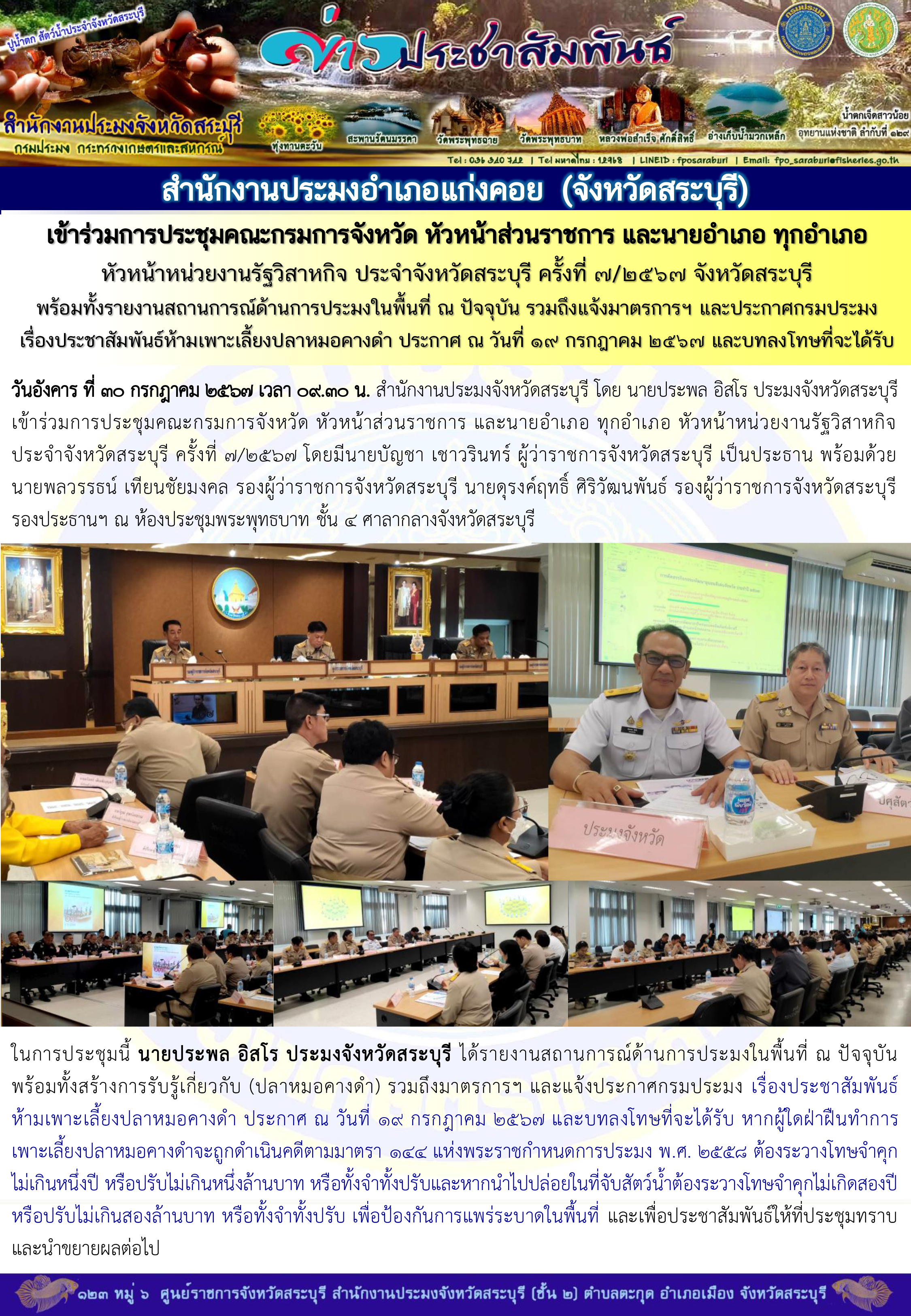 สำนักงานประมงจังหวัดสระบุรี เข้าร่วมการประชุมคณะกรมการจังหวัด หัวหน้าส่วนราชการ และนายอำเภอ ทุกอำเภอ หัวหน้าหน่วยงานรัฐวิสาหกิจ ประจำจังหวัดสระบุรี ครั้งที่ 7/2567 จังหวัดสระบุรี พร้อมทั้งสร้างการรับรู้เกี่ยวกับ (ปลาหมอคางดำ) รวมถึงมาตรการฯ และแจ้งประกาศกรมประมง เรื่องประชาสัมพันธ์ห้ามเพาะเลี้ยงปลาหมอคางดำ ประกาศ ณ วันที่ 19 กรกฎาคม 2567 และบทลงโทษที่จะได้รับ