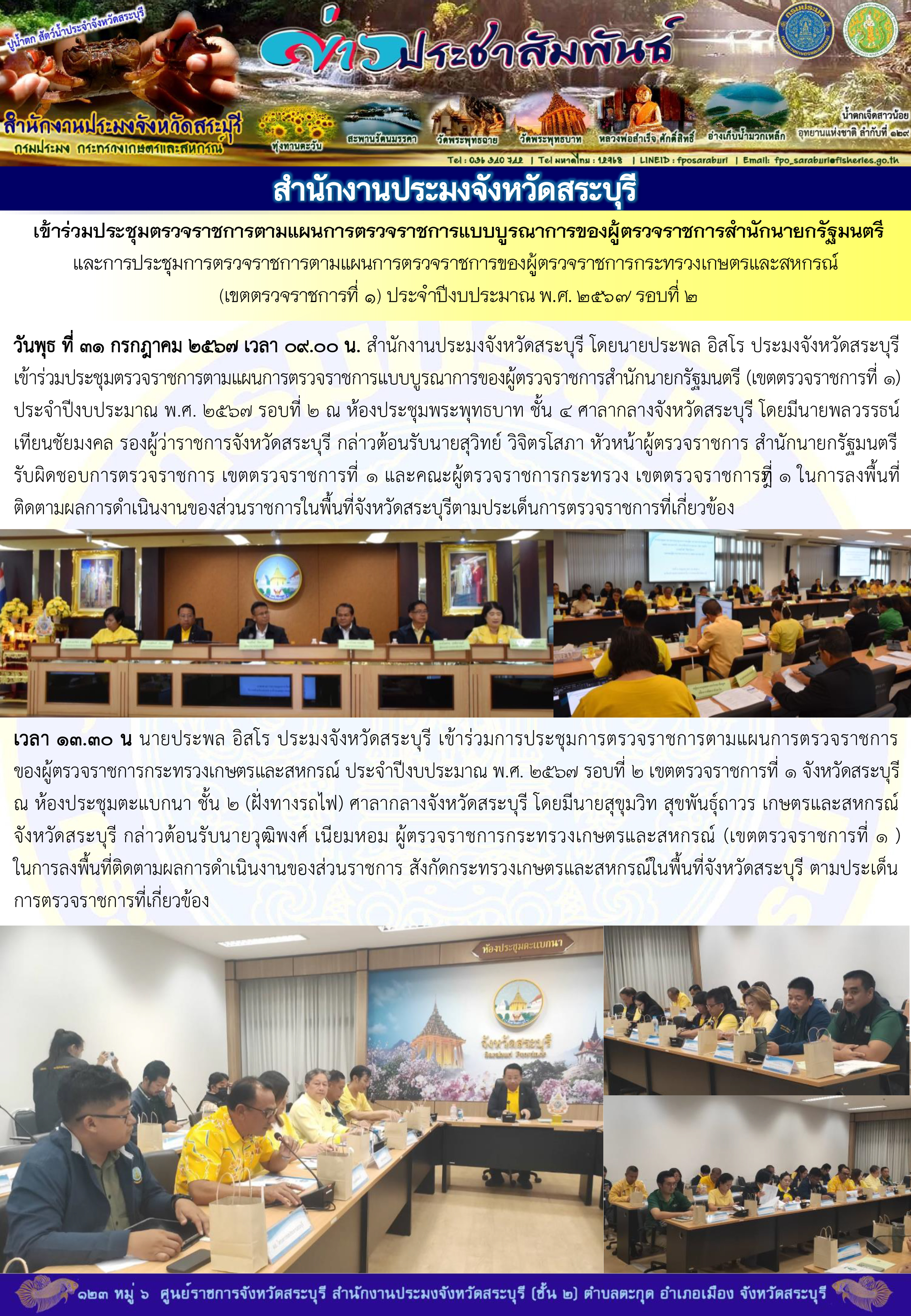 วันพุธ ที่ 31 กรกฎาคม 2567 เวลา 09.00 น. สำนักงานประมงจังหวัดสระบุรี โดยนายประพล อิสโร ประมงจังหวัดสระบุรี  เข้าร่วมประชุมตรวจราชการตามแผนการตรวจราชการแบบบูรณาการของผู้ตรวจราชการสำนักนายกรัฐมนตรี (เขตตรวจราชการที่ 1) ประจำปีงบประมาณ พ.ศ. 2567 รอบที่ 2 ณ ห้องประชุมพระพุทธบาท ชั้น 4 ศาลากลางจังหวัดสระบุรี โดยมีนายพลวรรธน์ เทียนชัยมงคล รองผู้ว่าราชการจังหวัดสระบุรี กล่าวต้อนรับนายสุวิทย์ วิจิตรโสภา หัวหน้าผู้ตรวจราชการ สำนักนายกรัฐมนตรีรับผิดชอบการตรวจราชการ เขตตรวจราชการที่ 1 และคณะผู้ตรวจราชการกระทรวง เขตตรวจราชการที่่ 1 ในการลงพื้นที่ติดตามผลการดำเนินงานของส่วนราชการในพื้นที่จังหวัดสระบุรีตามประเด็นการตรวจราชการที่เกี่ยวข้อง