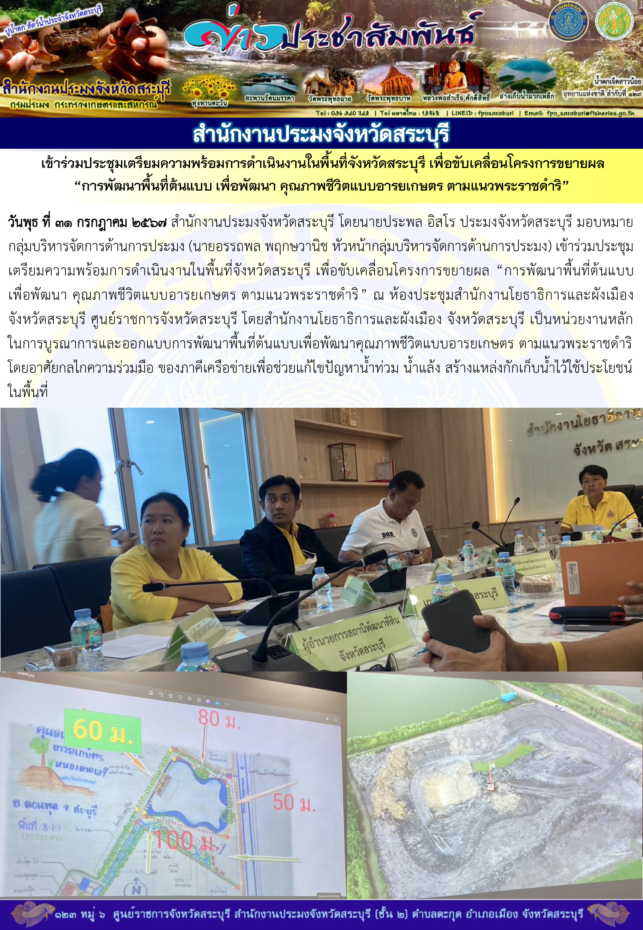 วันพุธ ที่ 31 กรกฎาคม 2567 สำนักงานประมงจังหวัดสระบุรี โดยนายประพล อิสโร ประมงจังหวัดสระบุรี มอบหมายกลุ่มบริหารจัดการด้านการประมง (นายอรรถพล พฤกษวานิช หัวหน้ากลุ่มบริหารจัดการด้านการประมง) เข้าร่วมประชุมเตรียมความพร้อมการดำเนินงานในพื้นที่จังหวัดสระบุรี เพื่อขับเคลื่อนโครงการขยายผล “การพัฒนาพื้นที่ต้นแบบ เพื่อพัฒนา คุณภาพชีวิตแบบอารยเกษตร ตามแนวพระราชดำริ” ณ ห้องประชุมสำนักงานโยธาธิการและผังเมือง จังหวัดสระบุรี ศูนย์ราชการจังหวัดสระบุรี โดยสำนักงานโยธาธิการและผังเมือง จังหวัดสระบุรี เป็นหน่วยงานหลักในการบูรณาการและออกแบบการพัฒนาพื้นที่ต้นแบบเพื่อพัฒนาคุณภาพชีวิตแบบอารยเกษตร ตามแนวพระราชดำริ โดยอาศัยกลไกความร่วมมือ ของภาคีเครือข่ายเพื่อช่วยแก้ไขปัญหาน้ำท่วม น้ำแล้ง สร้างแหล่งกักเก็บน้ำไว้ใช้ประโยชน์ในพื้นที่