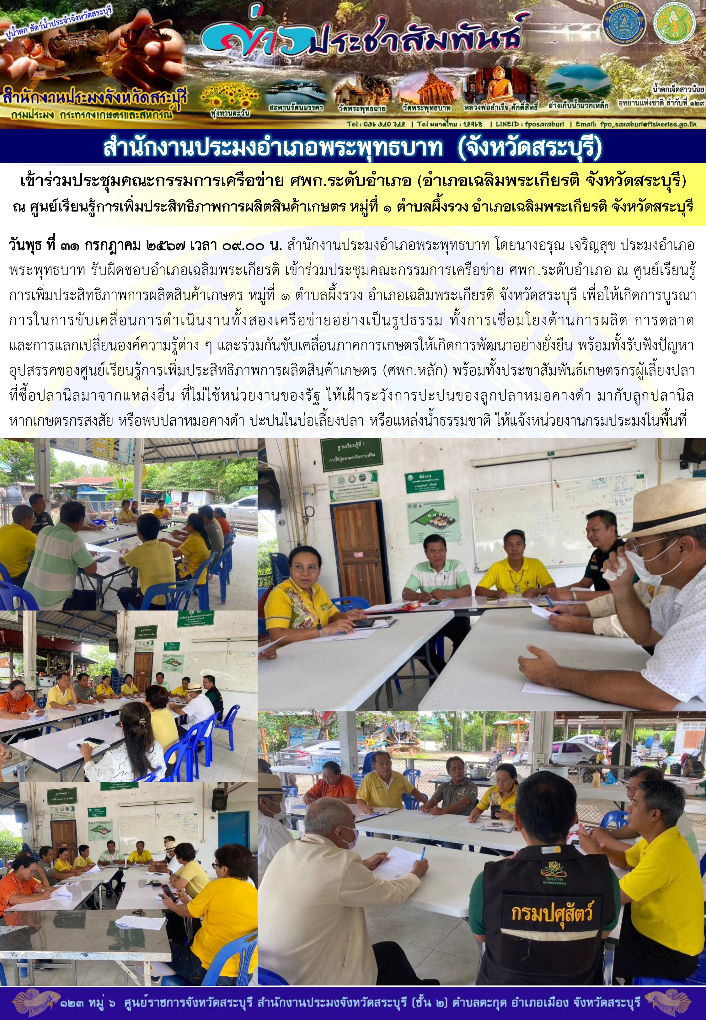 สำนักงานประมงอำเภอพระพุทธบาท เข้าร่วมประชุมคณะกรรมการเครือข่าย ศพก.ระดับอำเภอ (อำเภอเฉลิมพระเกียรติ จังหวัดสระบุรี) ณ ศูนย์เรียนรู้การเพิ่มประสิทธิภาพการผลิตสินค้าเกษตร หมู่ที่ 1 ตำบลผึ้งรวง อำเภอเฉลิมพระเกียรติ จังหวัดสระบุรี