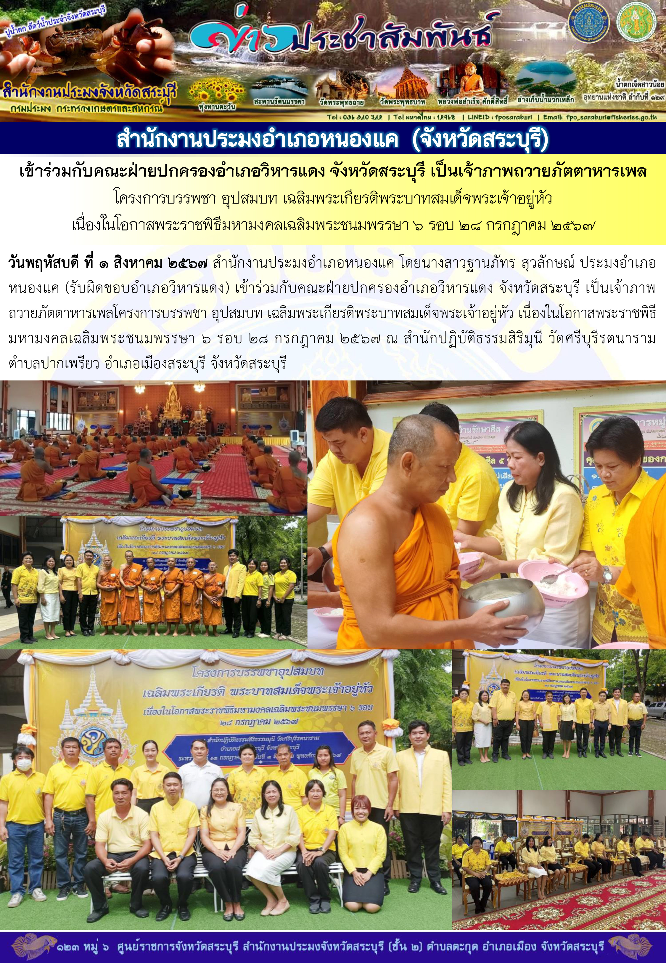 สำนักงานประมงอำเภอหนองแค เข้าร่วมกับคณะฝ่ายปกครองอำเภอวิหารแดง จังหวัดสระบุรี เป็นเจ้าภาพถวายภัตตาหารเพลโครงการบรรพชา อุปสมบท เฉลิมพระเกียรติพระบาทสมเด็จพระเจ้าอยู่หัว เนื่องในโอกาสพระราชพิธีมหามงคลเฉลิมพระชนมพรรษา 6 รอบ 28 กรกฎาคม 2567