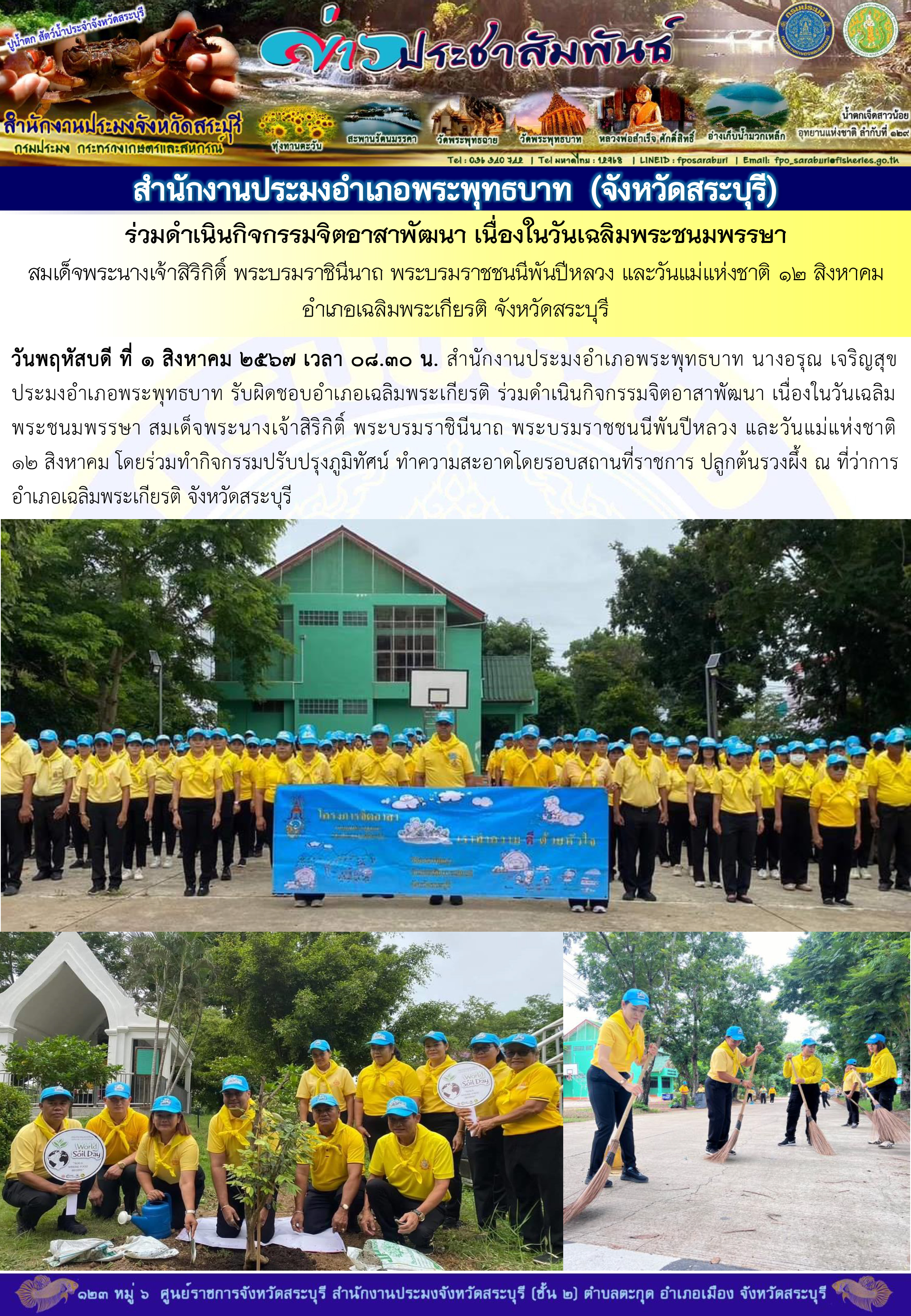 สำนักงานประมงอำเภอพระพุทธบาท ร่วมดำเนินกิจกรรมจิตอาสาพัฒนา เนื่องในวันเฉลิมพระชนมพรรษา สมเด็จพระนางเจ้าสิริกิติ์ พระบรมราชินีนาถ พระบรมราชชนนีพันปีหลวง และวันแม่แห่งชาติ 12 สิงหาคม อำเภอเฉลิมพระเกียรติ จังหวัดสระบุรี
