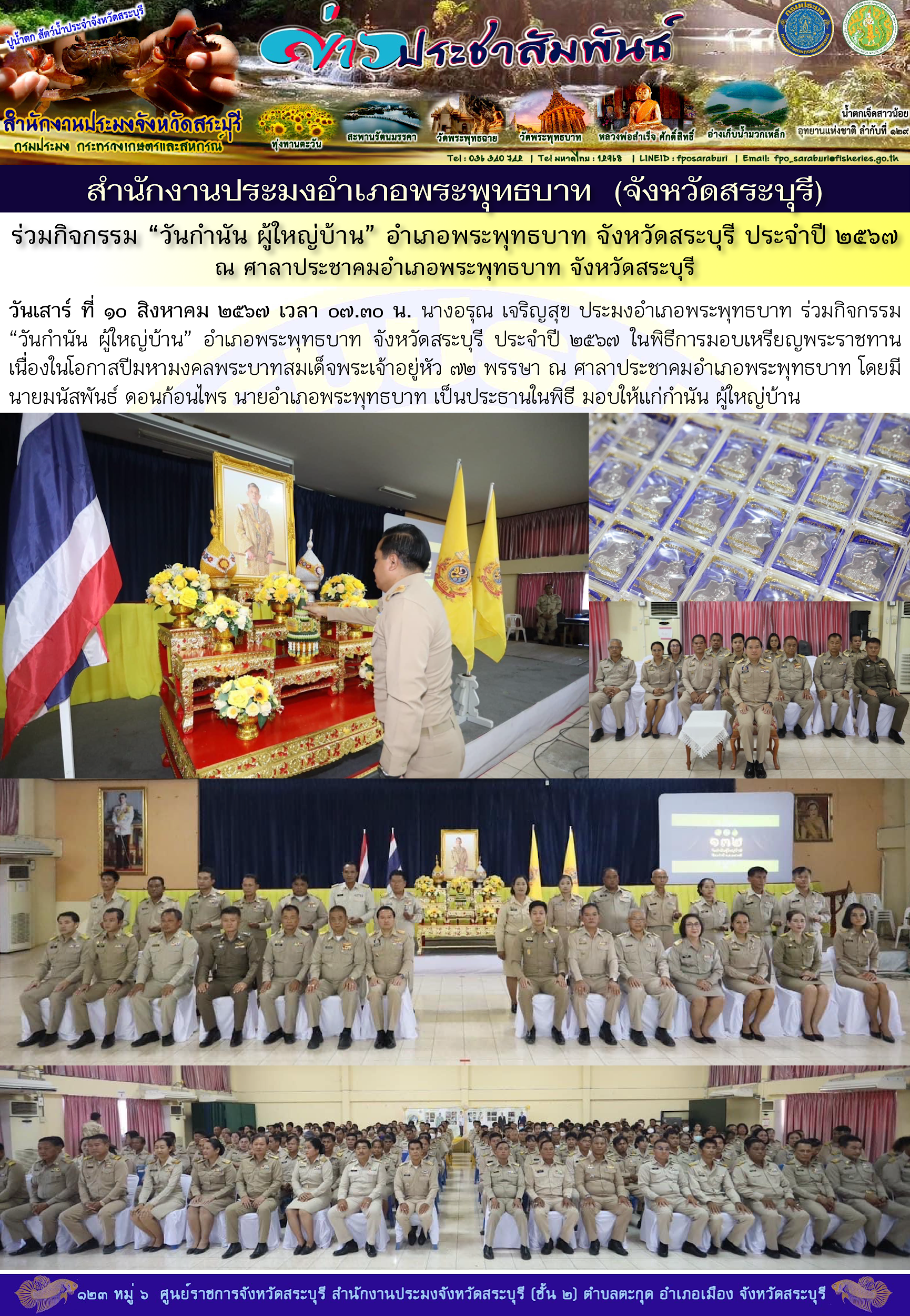 วันเสาร์ ที่ ๑๐ สิงหาคม ๒๕๖๗ เวลา ๐๗.๓๐ น. นางอรุณ เจริญสุข ประมงอำเภอพระพุทธบาท ร่วมกิจกรรม  “วันกำนัน ผู้ใหญ่บ้าน” อำเภอพระพุทธบาท จังหวัดสระบุรี ประจำปี ๒๕๖๗ ในพิธีการมอบเหรียญพระราชทาน เนื่องในโอกาสปีมหามงคลพระบาทสมเด็จพระเจ้าอยู่หัว ๗๒ พรรษา ณ ศาลาประชาคมอำเภอพระพุทธบาท โดยมีนายมนัสพันธ์ ดอนก้อนไพร นายอำเภอพระพุทธบาท เป็นประธานในพิธี มอบให้แก่กำนัน ผู้ใหญ่บ้าน