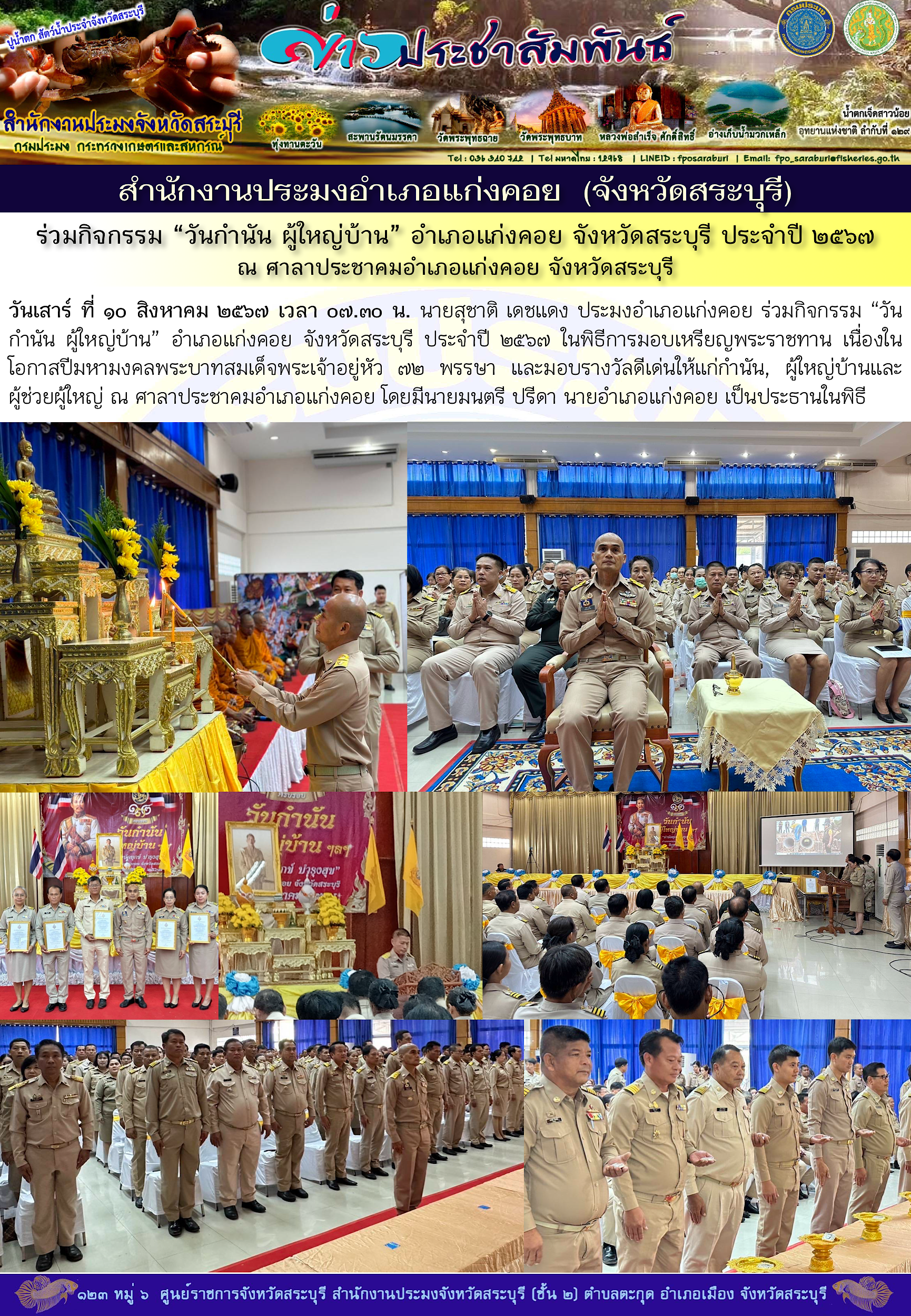 วันเสาร์ ที่ ๑๐ สิงหาคม ๒๕๖๗ เวลา ๐๗.๓๐ น. นายสุชาติ เดชแดง ประมงอำเภอแก่งคอย ร่วมกิจกรรม “วันกำนัน ผู้ใหญ่บ้าน” อำเภอแก่งคอย จังหวัดสระบุรี ประจำปี ๒๕๖๗ ในพิธีการมอบเหรียญพระราชทาน เนื่องในโอกาสปีมหามงคลพระบาทสมเด็จพระเจ้าอยู่หัว ๗๒ พรรษา และมอบรางวัลดีเด่นให้แก่กำนัน, ผู้ใหญ่บ้านและ   ผู้ช่วยผู้ใหญ่ ณ ศาลาประชาคมอำเภอแก่งคอย โดยมีนายมนตรี ปรีดา นายอำเภอแก่งคอย เป็นประธานในพิธี