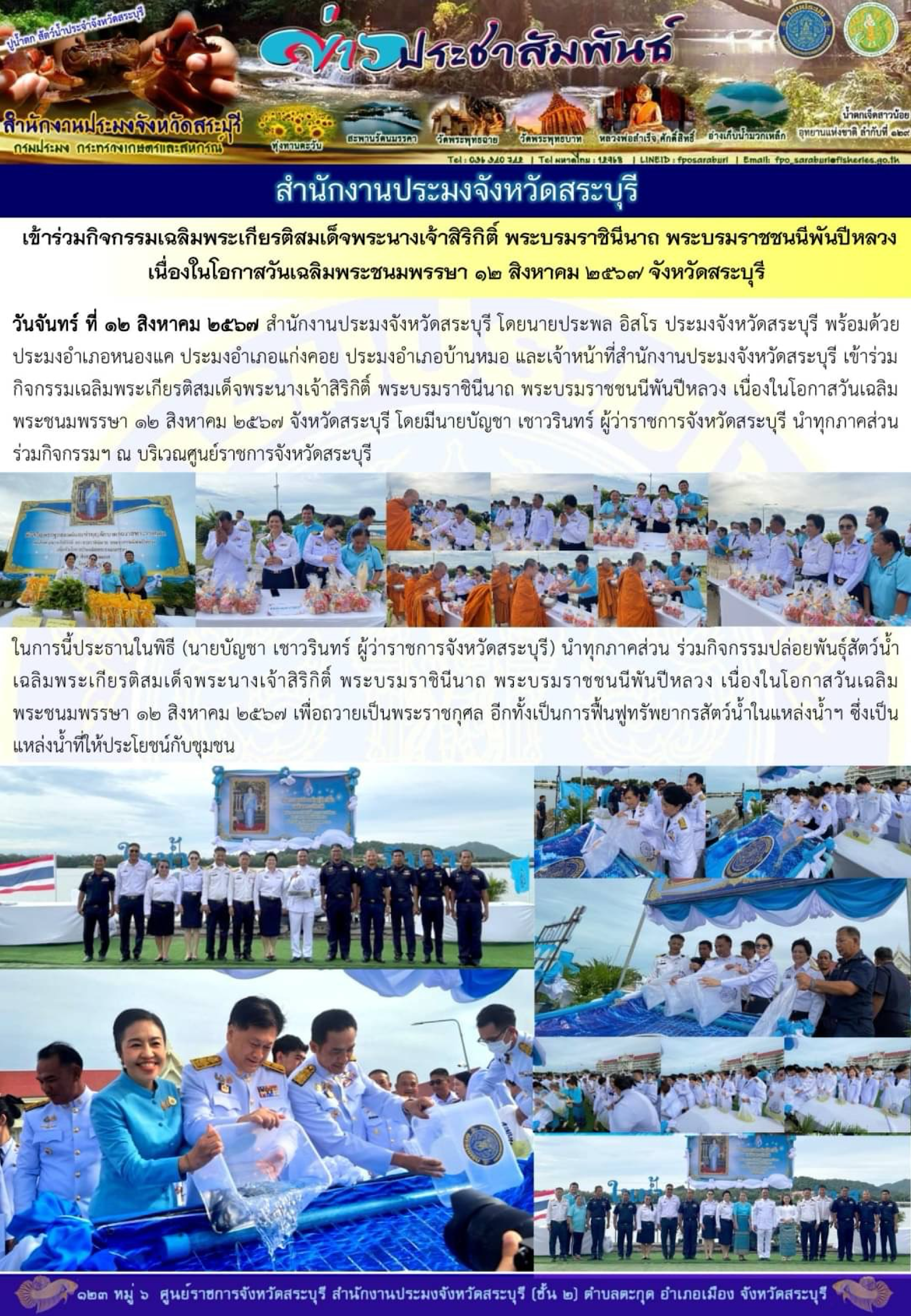 วันจันทร์ ที่ 12 สิงหาคม 2567 สำนักงานประมงจังหวัดสระบุรี โดยนายประพล อิสโร ประมงจังหวัดสระบุรี พร้อมด้วยประมงอำเภอหนองแค ประมงอำเภอแก่งคอย ประมงอำเภอบ้านหมอ และเจ้าหน้าที่สำนักงานประมงจังหวัดสระบุรี เข้าร่วมกิจกรรมเฉลิมพระเกียรติสมเด็จพระนางเจ้าสิริกิติ์ พระบรมราชินีนาถ พระบรมราชชนนีพันปีหลวง เนื่องในโอกาสวันเฉลิมพระชนมพรรษา 12 สิงหาคม 2567 จังหวัดสระบุรี โดยมีนายบัญชา เชาวรินทร์ ผู้ว่าราชการจังหวัดสระบุรี นำทุกภาคส่วน ร่วมกิจกรรมฯ ณ บริเวณศูนย์ราชการจังหวัดสระบุรี