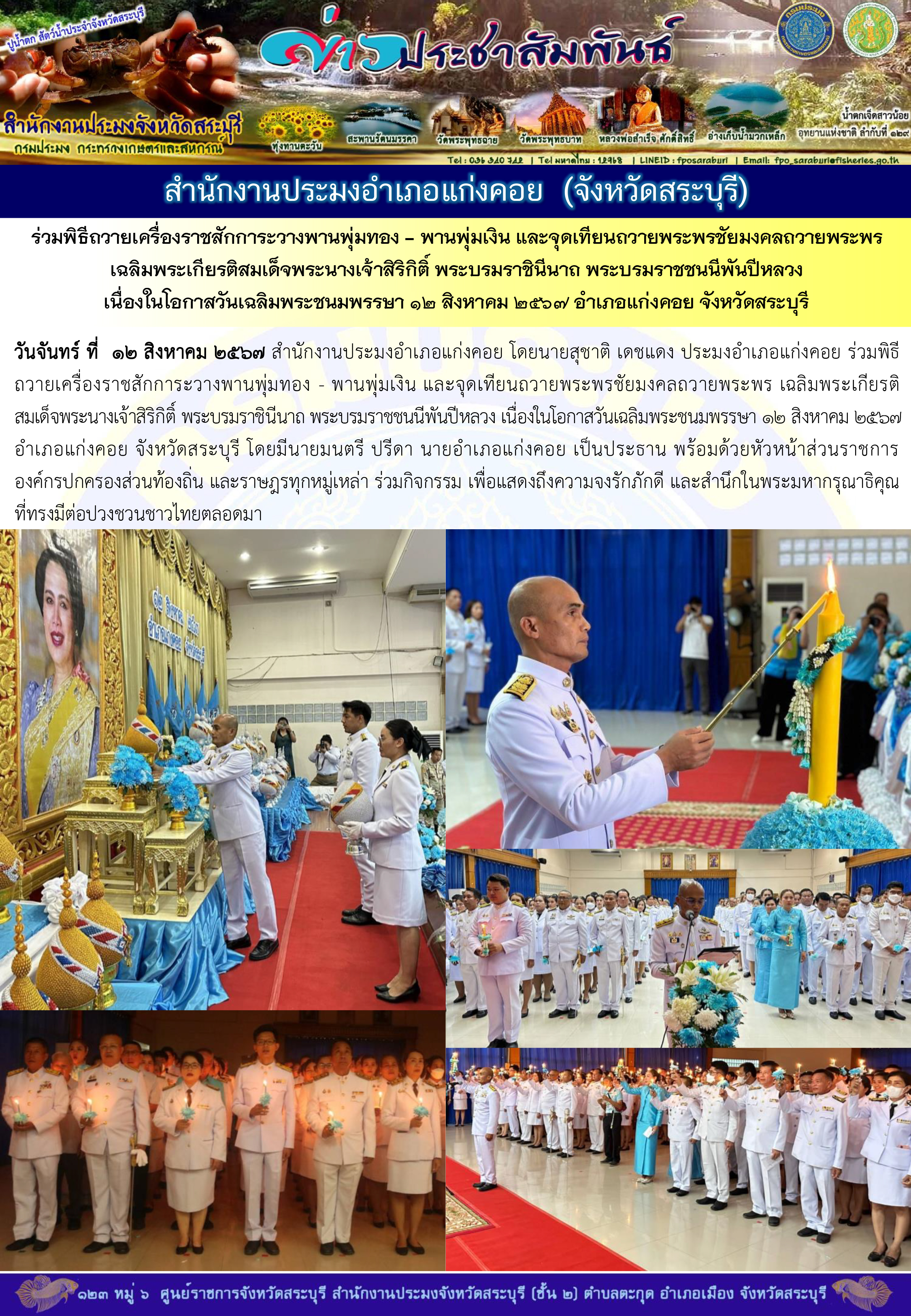 วันจันทร์ ที่  12 สิงหาคม 2567 สำนักงานประมงอำเภอแก่งคอย โดยนายสุชาติ เดชแดง ประมงอำเภอแก่งคอย ร่วมพิธีถวายเครื่องราชสักการะวางพานพุ่มทอง - พานพุ่มเงิน และจุดเทียนถวายพระพรชัยมงคลถวายพระพร เฉลิมพระเกียรติสมเด็จพระนางเจ้าสิริกิติ์ พระบรมราชินีนาถ พระบรมราชชนนีพันปีหลวง เนื่องในโอกาสวันเฉลิมพระชนมพรรษา ๑๒ สิงหาคม ๒๕๖๗ อำเภอแก่งคอย จังหวัดสระบุรี โดยมีนายมนตรี ปรีดา นายอำเภอแก่งคอย เป็นประธาน พร้อมด้วยหัวหน้าส่วนราชการ องค์กรปกครองส่วนท้องถิ่น และราษฎรทุกหมู่เหล่า ร่วมกิจกรรม เพื่อแสดงถึงความจงรักภักดี และสำนึกในพระมหากรุณาธิคุณที่ทรงมีต่อปวงชวนชาวไทยตลอดมา