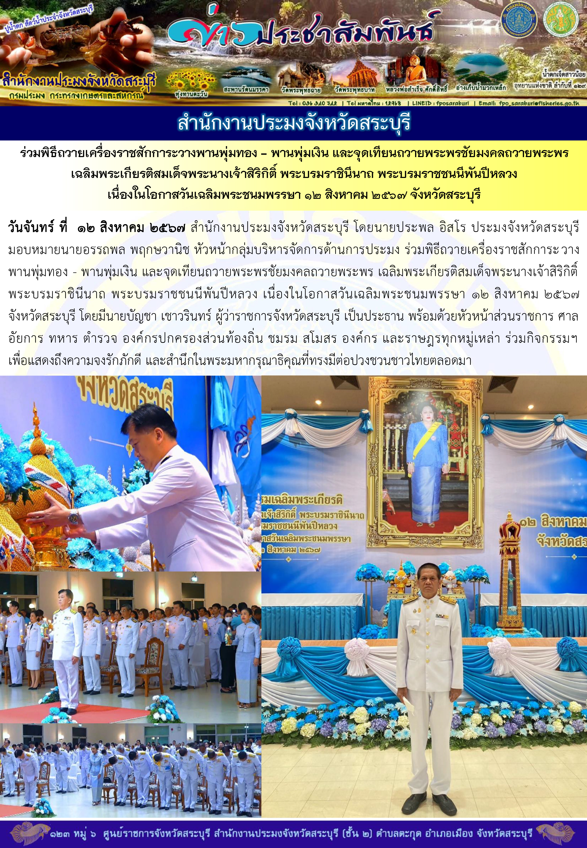 วันจันทร์ ที่  12 สิงหาคม 2567 สำนักงานประมงจังหวัดสระบุรี โดยนายประพล อิสโร ประมงจังหวัดสระบุรี มอบหมายนายอรรถพล พฤกษวานิช หัวหน้ากลุ่มบริหารจัดการด้านการประมง ร่วมพิธีถวายเครื่องราชสักการะวางพานพุ่มทอง - พานพุ่มเงิน และจุดเทียนถวายพระพรชัยมงคลถวายพระพร เฉลิมพระเกียรติสมเด็จพระนางเจ้าสิริกิติ์ พระบรมราชินีนาถ พระบรมราชชนนีพันปีหลวง เนื่องในโอกาสวันเฉลิมพระชนมพรรษา ๑๒ สิงหาคม ๒๕๖๗ จังหวัดสระบุรี โดยมีนายบัญชา เชาวรินทร์ ผู้ว่าราชการจังหวัดสระบุรี เป็นประธาน พร้อมด้วยหัวหน้าส่วนราชการ ศาล อัยการ ทหาร ตำรวจ องค์กรปกครองส่วนท้องถิ่น ชมรม สโมสร องค์กร และราษฎรทุกหมู่เหล่า ร่วมกิจกรรมฯ เพื่อแสดงถึงความจงรักภักดี และสำนึกในพระมหากรุณาธิคุณที่ทรงมีต่อปวงชวนชาวไทยตลอดมา