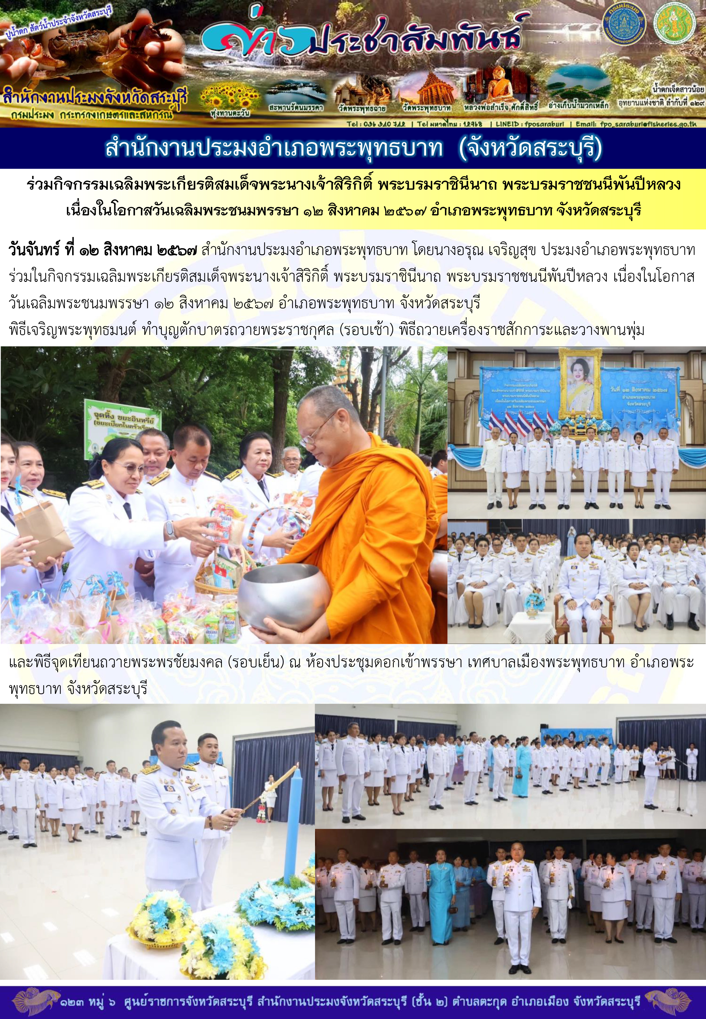 วันจันทร์ ที่ 12 สิงหาคม 2567 สำนักงานประมงอำเภอพระพุทธบาท โดยนางอรุณ เจริญสุข ประมงอำเภอพระพุทธบาท ร่วมในกิจกรรมเฉลิมพระเกียรติสมเด็จพระนางเจ้าสิริกิติ์ พระบรมราชินีนาถ พระบรมราชชนนีพันปีหลวง เนื่องในโอกาสวันเฉลิมพระชนมพรรษา 12 สิงหาคม 2567 อำเภอพระพุทธบาท จังหวัดสระบุรี พิธีเจริญพระพุทธมนต์ ทำบุญตักบาตรถวายพระราชกุศล (รอบเช้า) พิธีถวายเครื่องราชสักการะและวางพานพุ่ม และพิธีจุดเทียนถวายพระพรชัยมงคล (รอบเย็น) ณ ห้องประชุมดอกเข้าพรรษา เทศบาลเมืองพระพุทธบาท อำเภอพระพุทธบาท จังหวัดสระบุรี