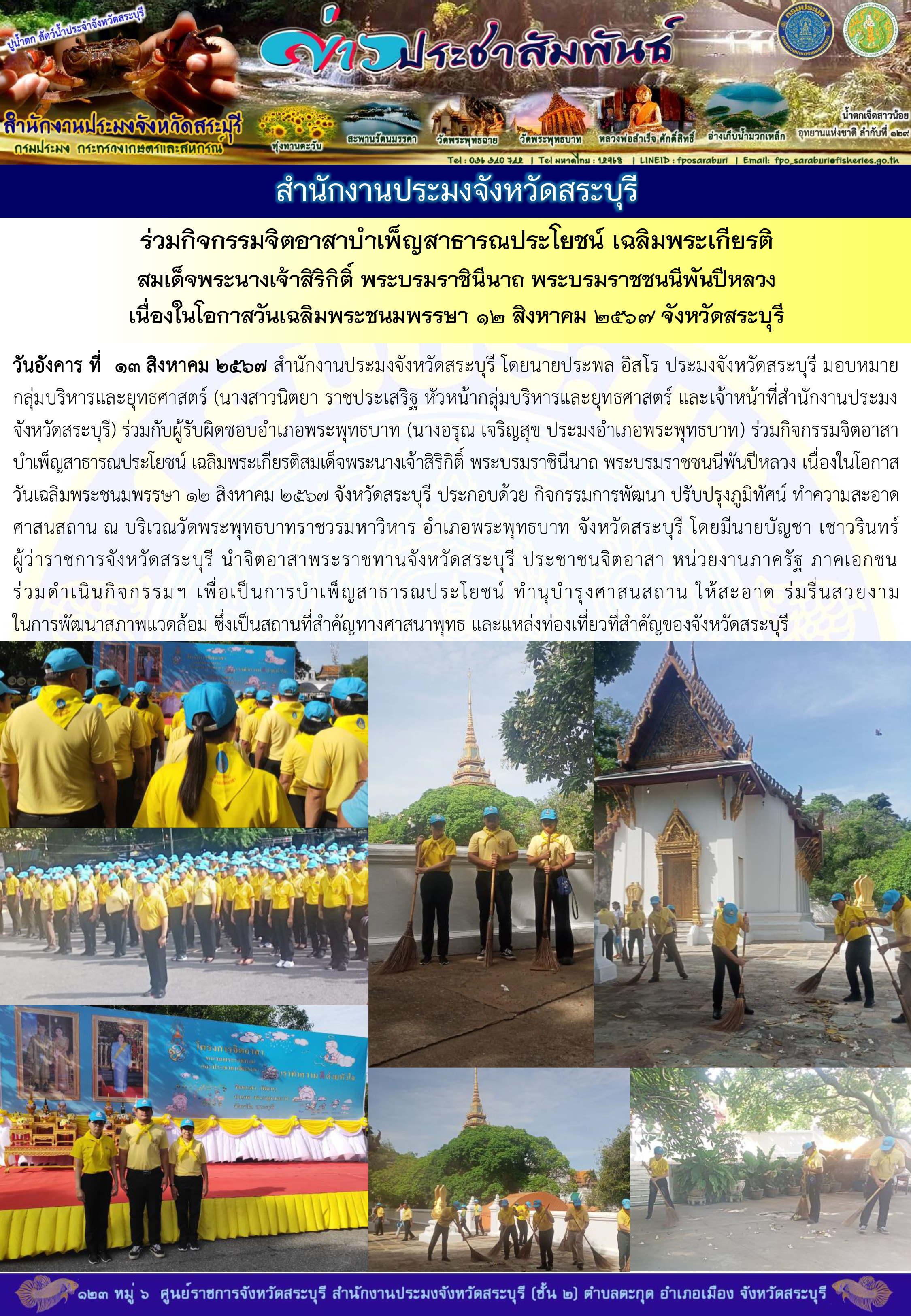 สำนักงานประมงจังหวัดสระบุรี ร่วมกิจกรรมจิตอาสาบำเพ็ญสาธารณประโยชน์ เฉลิมพระเกียรติสมเด็จพระนางเจ้าสิริกิติ์ พระบรมราชินีนาถ พระบรมราชชนนีพันปีหลวง เนื่องในโอกาสวันเฉลิมพระชนมพรรษา ๑๒ สิงหาคม ๒๕๖๗ จังหวัดสระบุรี ประกอบด้วย กิจกรรมการพัฒนา ปรับปรุงภูมิทัศน์ ทำความสะอาดศาสนสถาน ณ บริเวณวัดพระพุทธบาทราชวรมหาวิหาร อำเภอพระพุทธบาท จังหวัดสระบุรี
