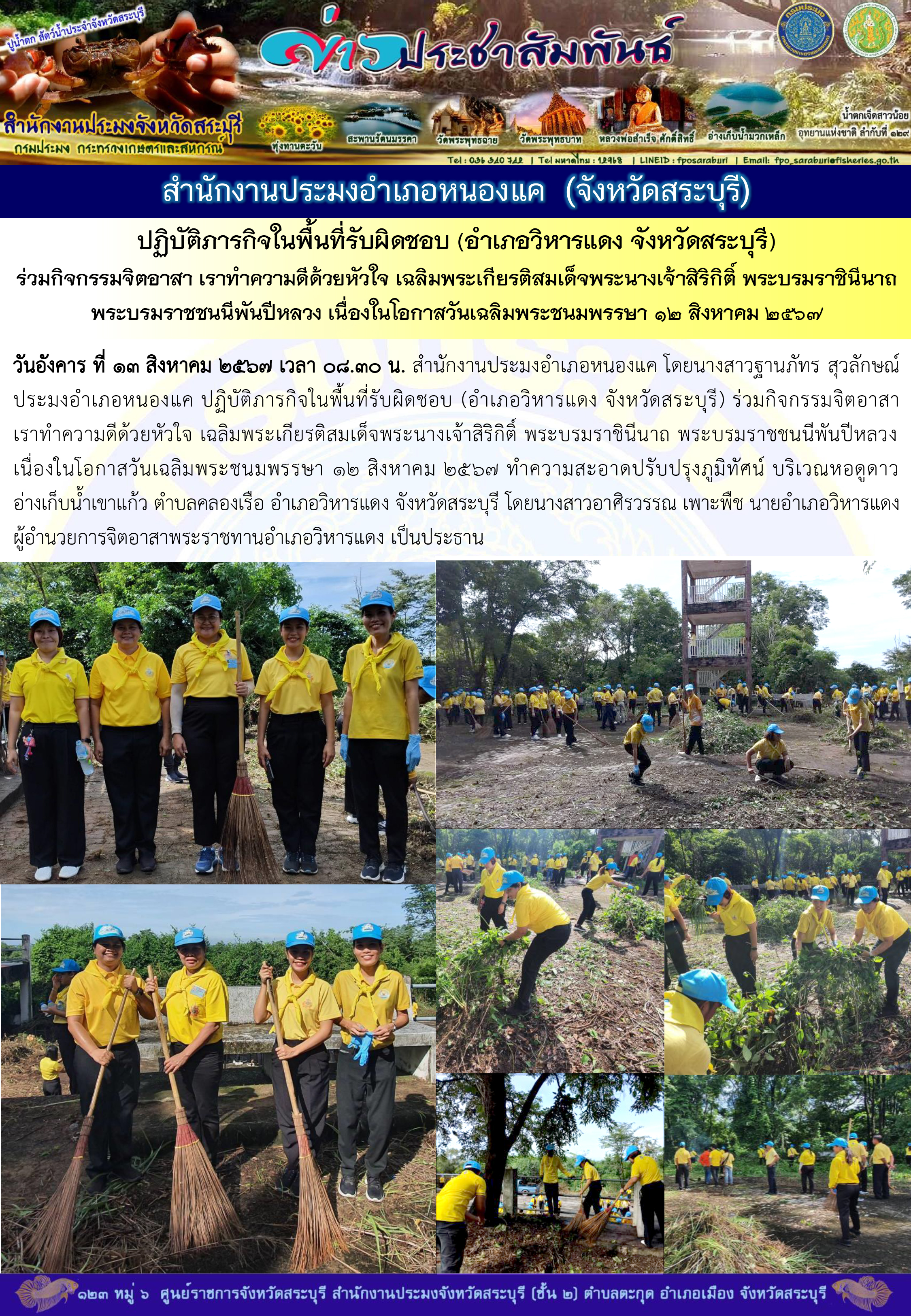 สำนักงานประมงอำเภอหนองแค ปฏิบัติภารกิจในพื้นที่รับผิดชอบ (อำเภอวิหารแดง จังหวัดสระบุรี) ร่วมกิจกรรมจิตอาสา เราทำความดีด้วยหัวใจ เฉลิมพระเกียรติสมเด็จพระนางเจ้าสิริกิติ์ พระบรมราชินีนาถ พระบรมราชชนนีพันปีหลวง เนื่องในโอกาสวันเฉลิมพระชนมพรรษา 12 สิงหาคม 2567
