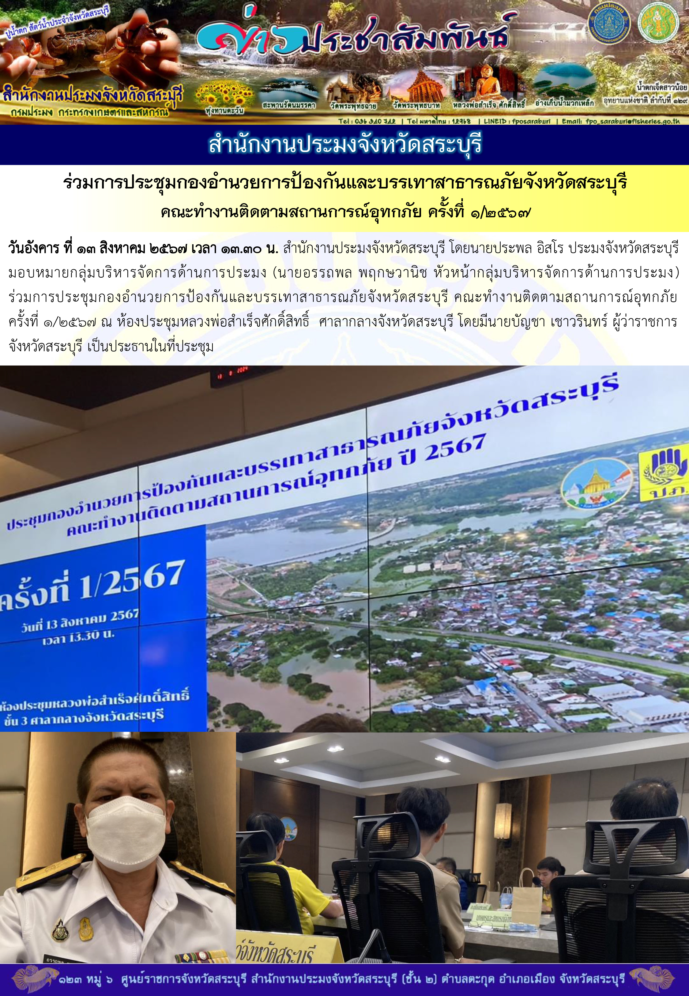 วันอังคาร ที่ 13 สิงหาคม 2567 เวลา 13.30 น. สำนักงานประมงจังหวัดสระบุรี โดยนายประพล อิสโร ประมงจังหวัดสระบุรี มอบหมายกลุ่มบริหารจัดการด้านการประมง (นายอรรถพล พฤกษวานิช หัวหน้ากลุ่มบริหารจัดการด้านการประมง) ร่วมการประชุมกองอำนวยการป้องกันและบรรเทาสาธารณภัยจังหวัดสระบุรี คณะทำงานติดตามสถานการณ์อุทกภัย ครั้งที่ 1/2567 ณ ห้องประชุมหลวงพ่อสำเร็จศักดิ์สิทธิ์  ศาลากลางจังหวัดสระบุรี โดยมีนายบัญชา เชาวรินทร์ ผู้ว่าราชการจังหวัดสระบุรี เป็นประธานในที่ประชุมฯ