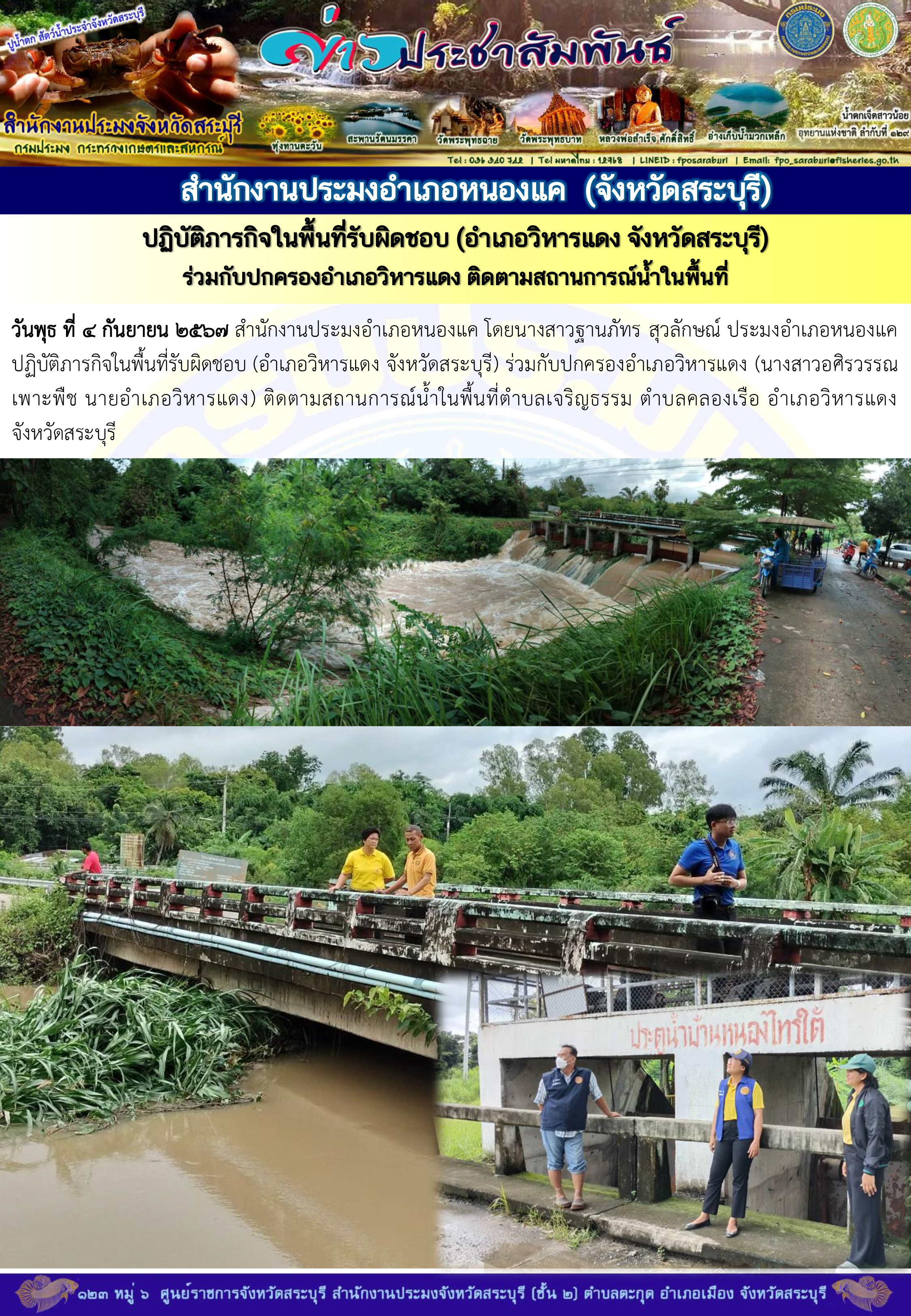 สำนักงานประมงอำเภอหนองแค ปฏิบัติภารกิจในพื้นที่รับผิดชอบ (อำเภอวิหารแดง จังหวัดสระบุรี) ร่วมกับปกครองอำเภอวิหารแดง ติดตามสถานการณ์น้ำในพื้นที่