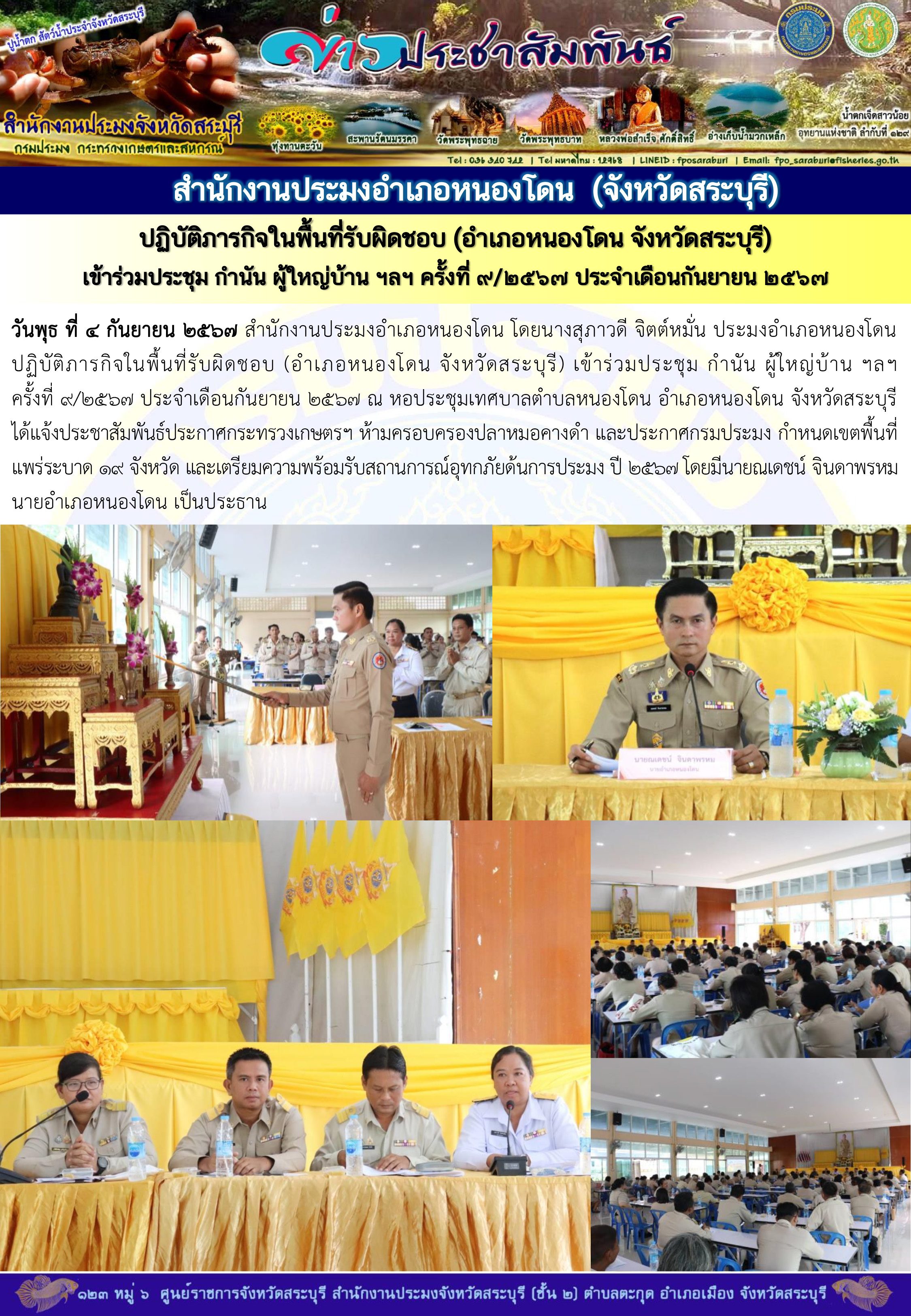 สำนักงานประมงอำเภอหนองโดน ปฏิบัติภารกิจในพื้นที่รับผิดชอบ (อำเภอหนองโดน จังหวัดสระบุรี) เข้าร่วมประชุม กำนัน ผู้ใหญ่บ้าน ฯลฯ ครั้งที่ 9/2567 ประจำเดือนกันยายน 2567