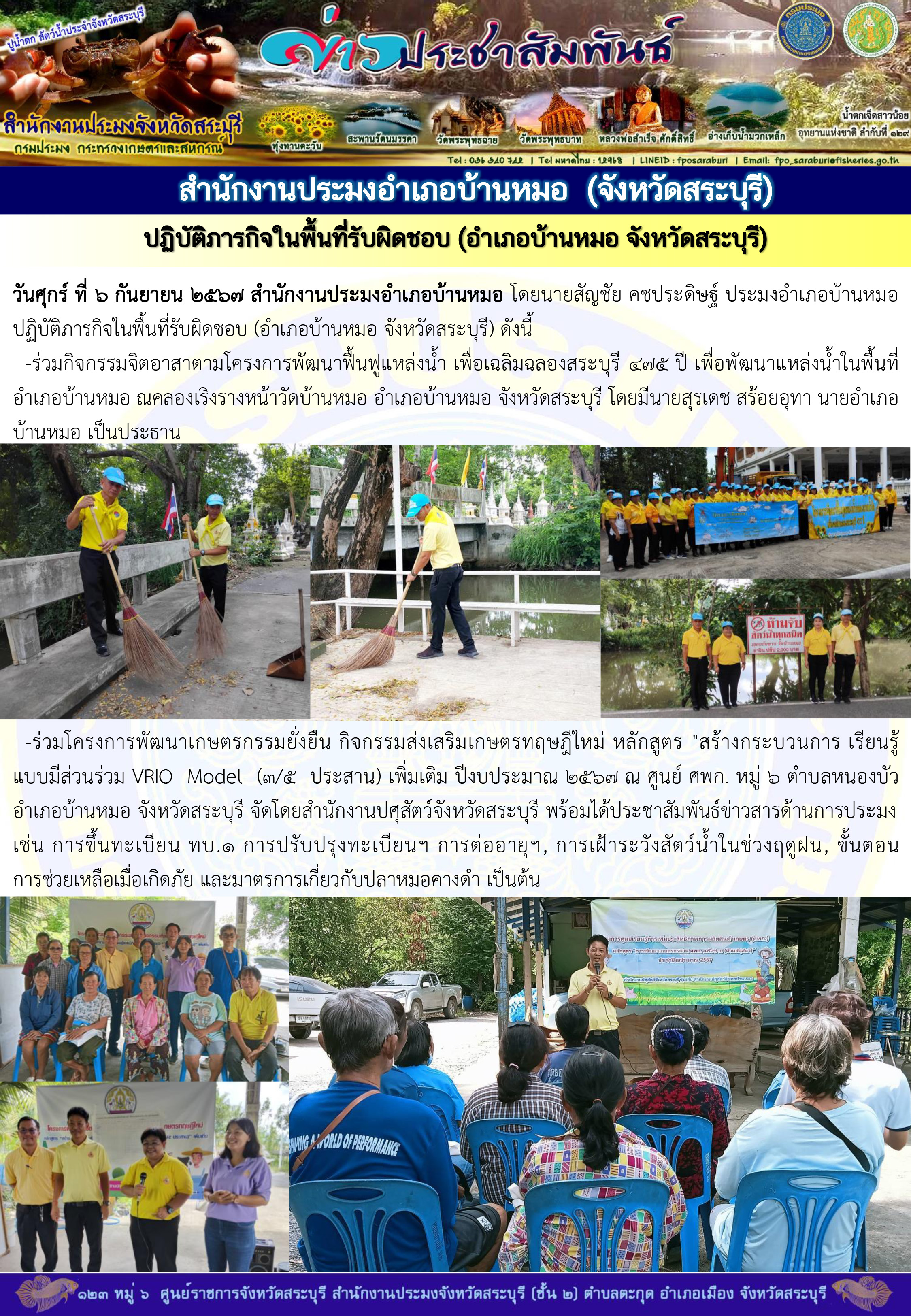 -ร่วมโครงการพัฒนาเกษตรกรรมยั่งยืน กิจกรรมส่งเสริมเกษตรทฤษฎีใหม่ หลักสูตร "สร้างกระบวนการ เรียนรู้แบบมีส่วนร่วม VRIO Model (3/5 ประสาน) เพิ่มเติม ปีงบประมาณ 2567 ณ ศูนย์ ศพก. หมู่ 6 ตำบลหนองบัว อำเภอบ้านหมอ จังหวัดสระบุรี จัดโดยสำนักงานปศุสัตว์จังหวัดสระบุรี พร้อมได้ประชาสัมพันธ์ข่าวสารด้านการประมง เช่น การขึ้นทะเบียน ทบ.1 การปรับปรุงทะเบียนฯ การต่ออายุฯ, การเฝ้าระวังสัตว์น้ำในช่วงฤดูฝน, ขั้นตอนการช่วยเหลือเมื่อเกิดภัย และมาตรการเกี่ยวกับปลาหมอคางดำ เป็นต้น