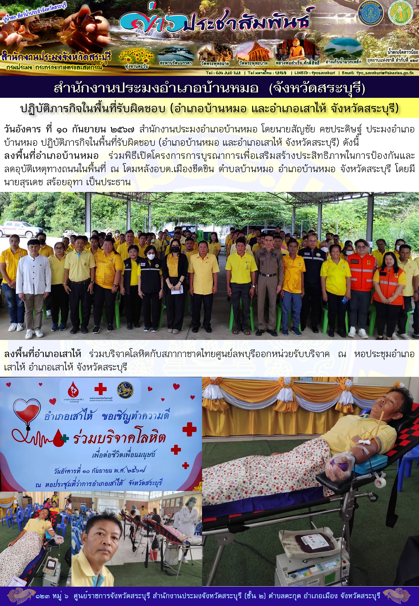 ลงพื้นที่อำเภอเสาไห้ ร่วมบริจาคโลหิตกับสภากาชาดไทยศูนย์ลพบุรีออกหน่วยรับบริจาค ณ หอประชุมอำเภอเสาไห้ อำเภอเสาไห้ จังหวัดสระบุรี