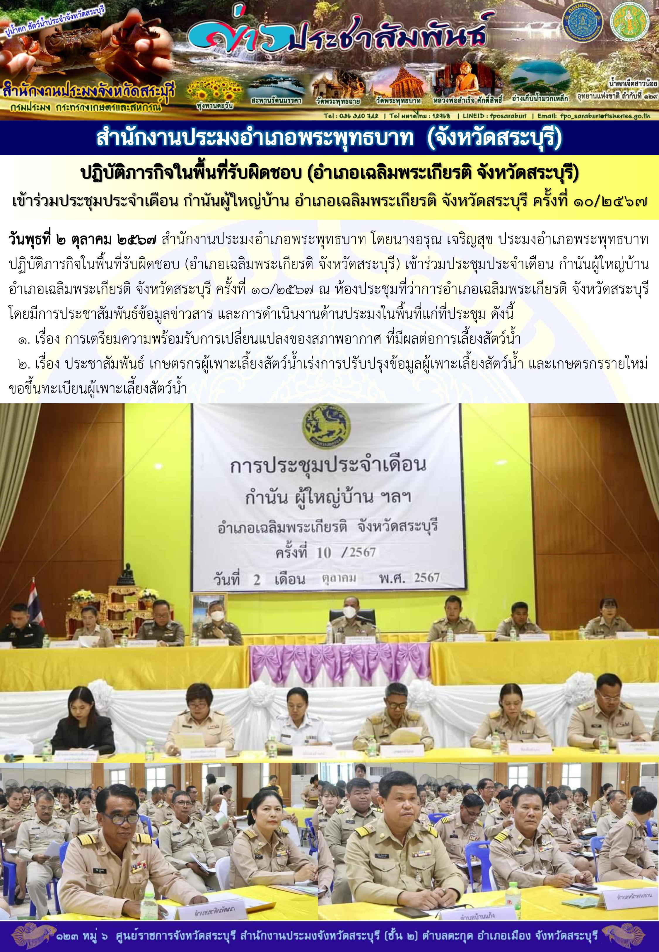 สำนักงานประมงอำเภอพระพุทธบาท ปฏิบัติภารกิจในพื้นที่รับผิดชอบ (อำเภอเฉลิมพระเกียรติ จังหวัดสระบุรี) เข้าร่วมประชุมประจำเดือน กำนันผู้ใหญ่บ้าน อำเภอเฉลิมพระเกียรติ จังหวัดสระบุรี ครั้งที่ 10/2567