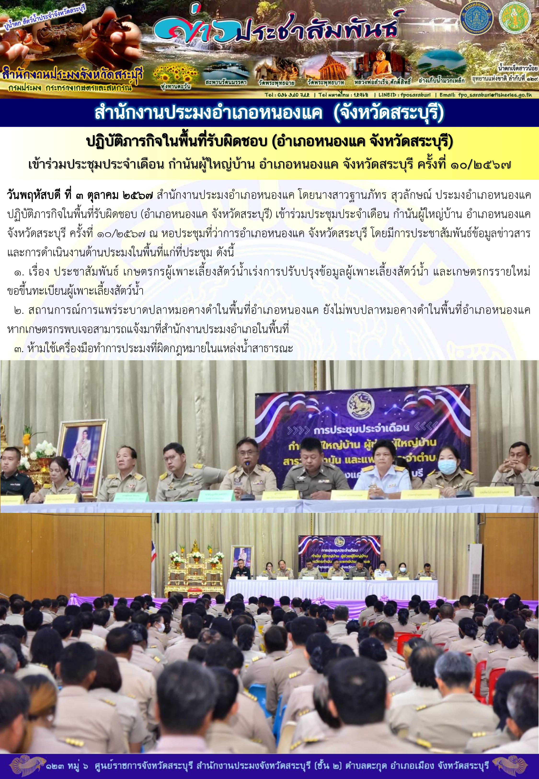 สำนักงานประมงอำเภอหนองแค ปฏิบัติภารกิจในพื้นที่รับผิดชอบ (อำเภอหนองแค จังหวัดสระบุรี) เข้าร่วมประชุมประจำเดือน กำนันผู้ใหญ่บ้าน อำเภอหนองแค จังหวัดสระบุรี ครั้งที่ 10/2567