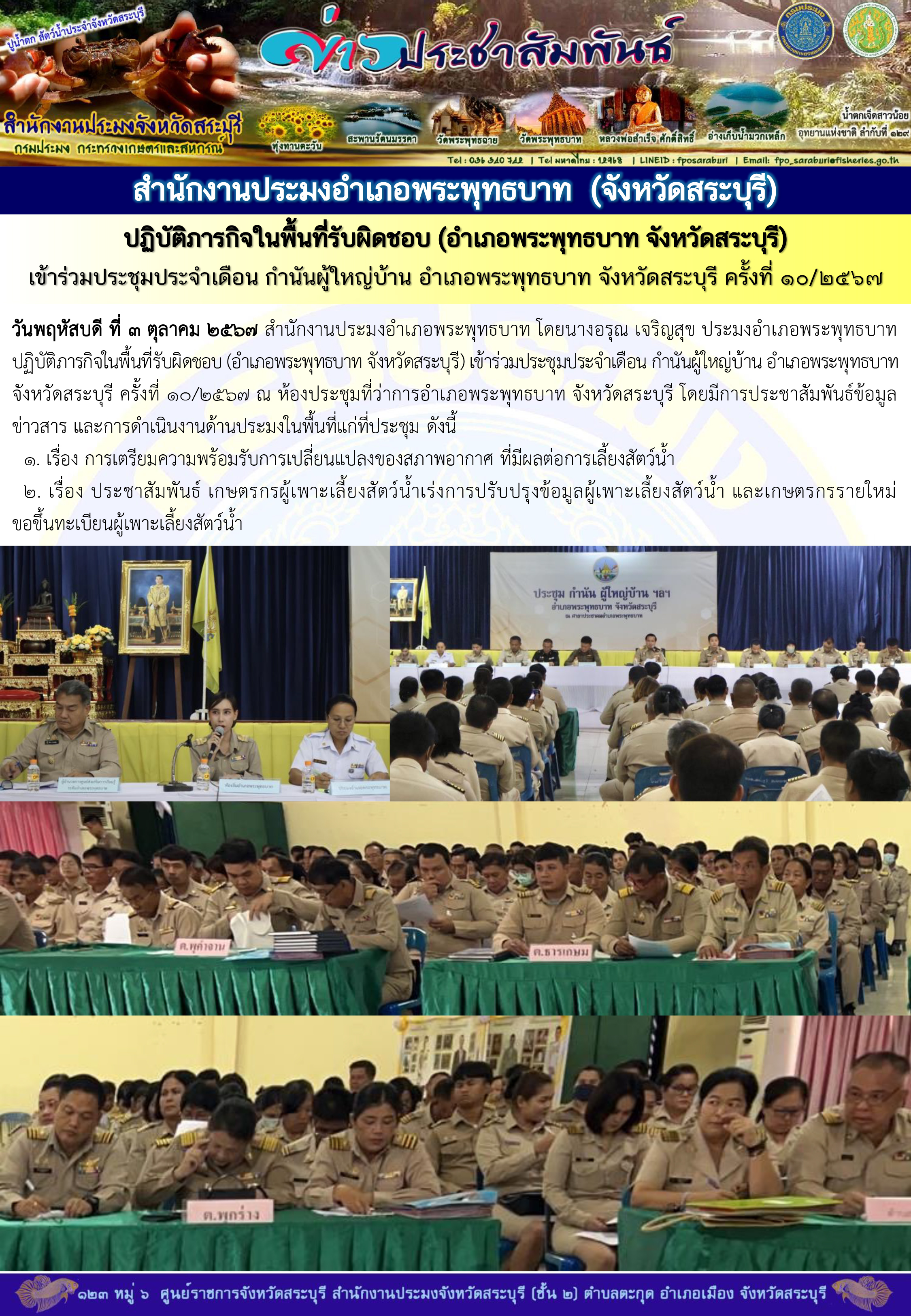สำนักงานประมงอำเภอพระพุทธบาท ปฏิบัติภารกิจในพื้นที่รับผิดชอบ (อำเภอพระพุทธบาท จังหวัดสระบุรี) เข้าร่วมประชุมประจำเดือน กำนันผู้ใหญ่บ้าน อำเภอพระพุทธบาท จังหวัดสระบุรี ครั้งที่ 10/2567