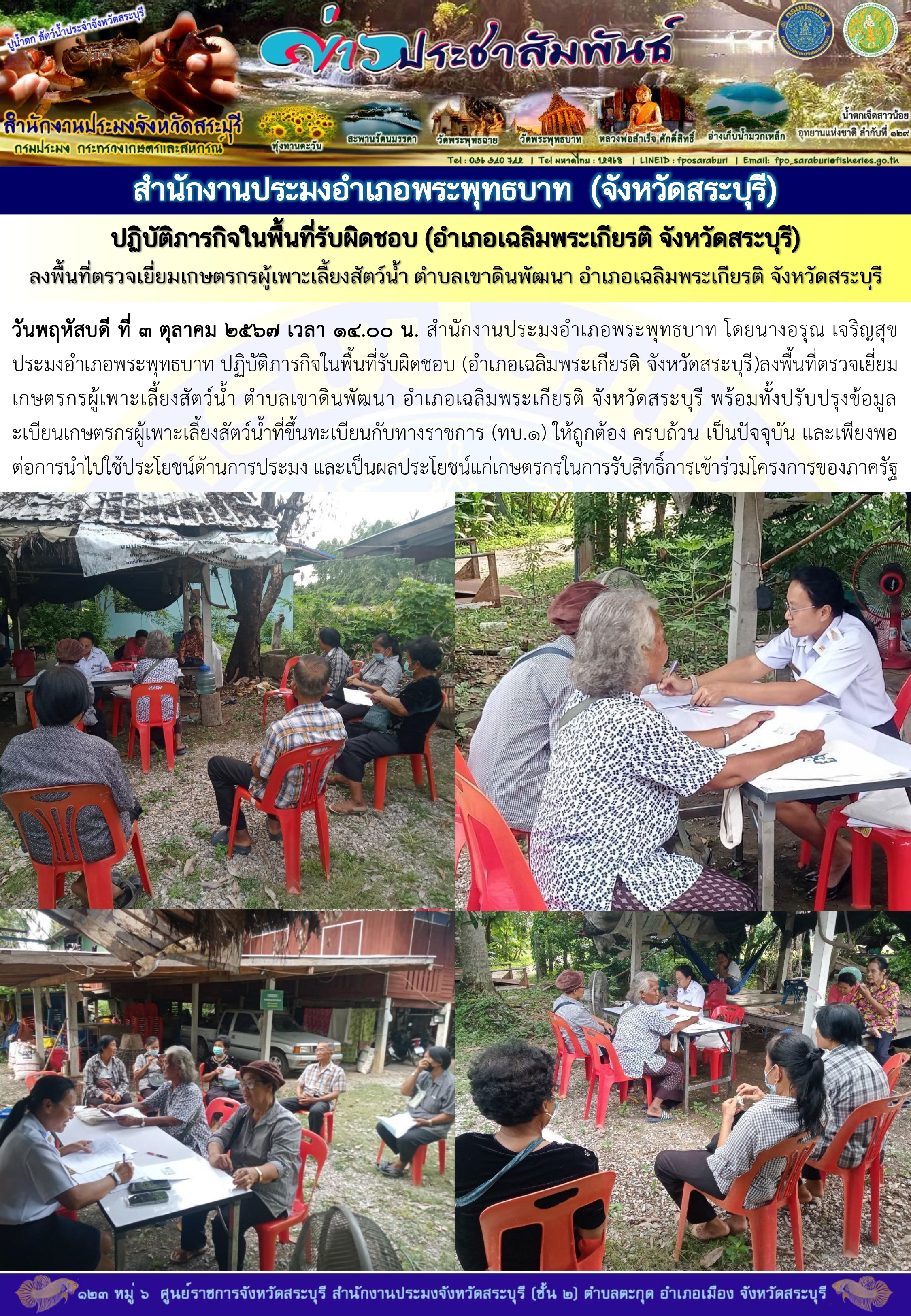 วันพฤหัสบดี ที่ 3 ตุลาคม 2567 เวลา 14.00 น. สำนักงานประมงอำเภอพระพุทธบาท โดยนางอรุณ เจริญสุข ประมงอำเภอพระพุทธบาท ปฏิบัติภารกิจในพื้นที่รับผิดชอบ (อำเภอเฉลิมพระเกียรติ จังหวัดสระบุรี)ลงพื้นที่ตรวจเยี่ยมเกษตรกรผู้เพาะเลี้ยงสัตว์น้ำ ตำบลเขาดินพัฒนา อำเภอเฉลิมพระเกียรติ จังหวัดสระบุรี พร้อมทั้งปรับปรุงข้อมูลทะเบียนเกษตรกรผู้เพาะเลี้ยงสัตว์น้ำที่ขึ้นทะเบียนกับทางราชการ (ทบ.๑) ให้ถูกต้อง ครบถ้วน เป็นปัจจุบัน และเพียงพอต่อการนำไปใช้ประโยชน์ด้านการประมง และเป็นผลประโยชน์แก่เกษตรกรในการรับสิทธิ์การเข้าร่วมโครงการของภาครัฐ