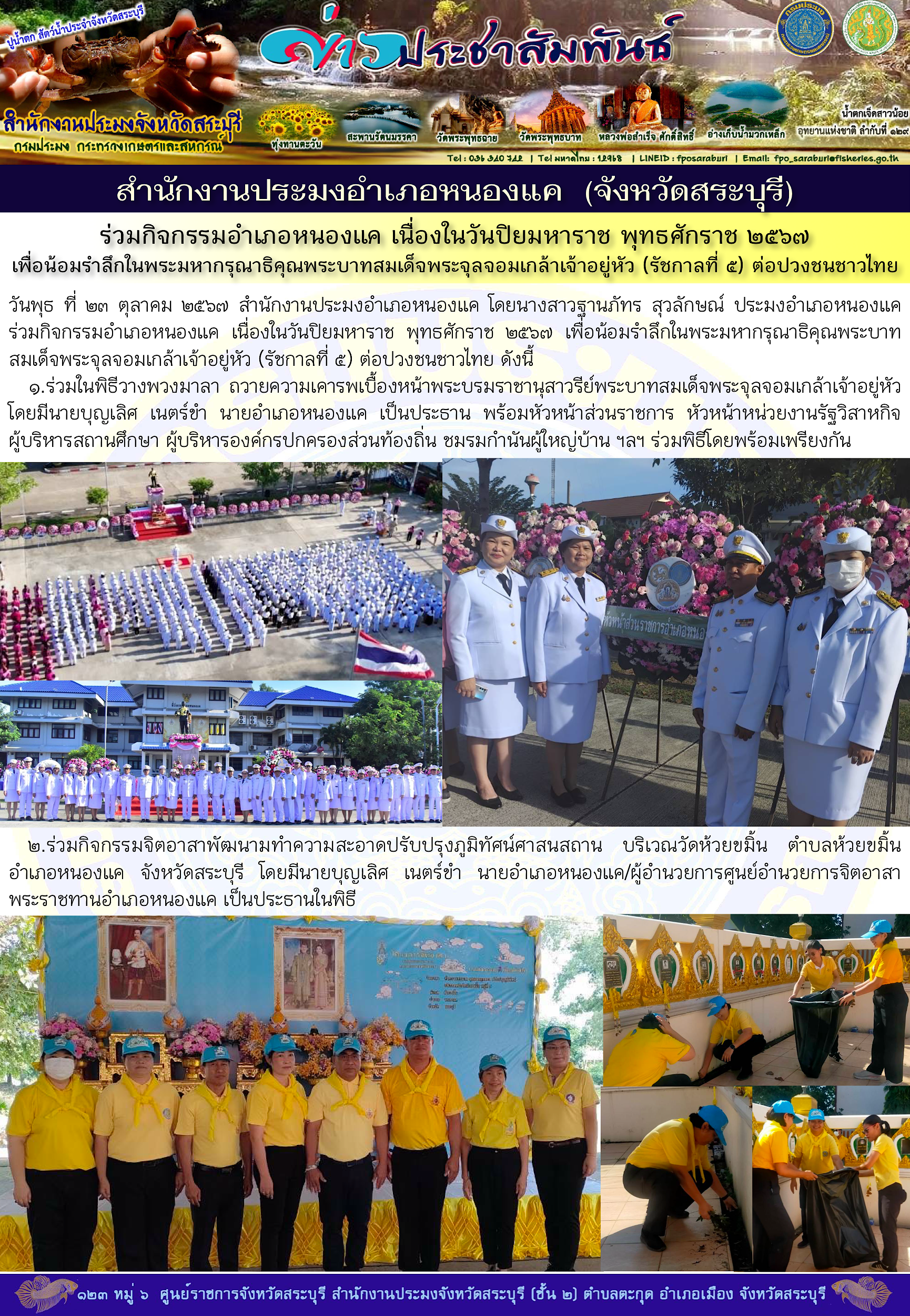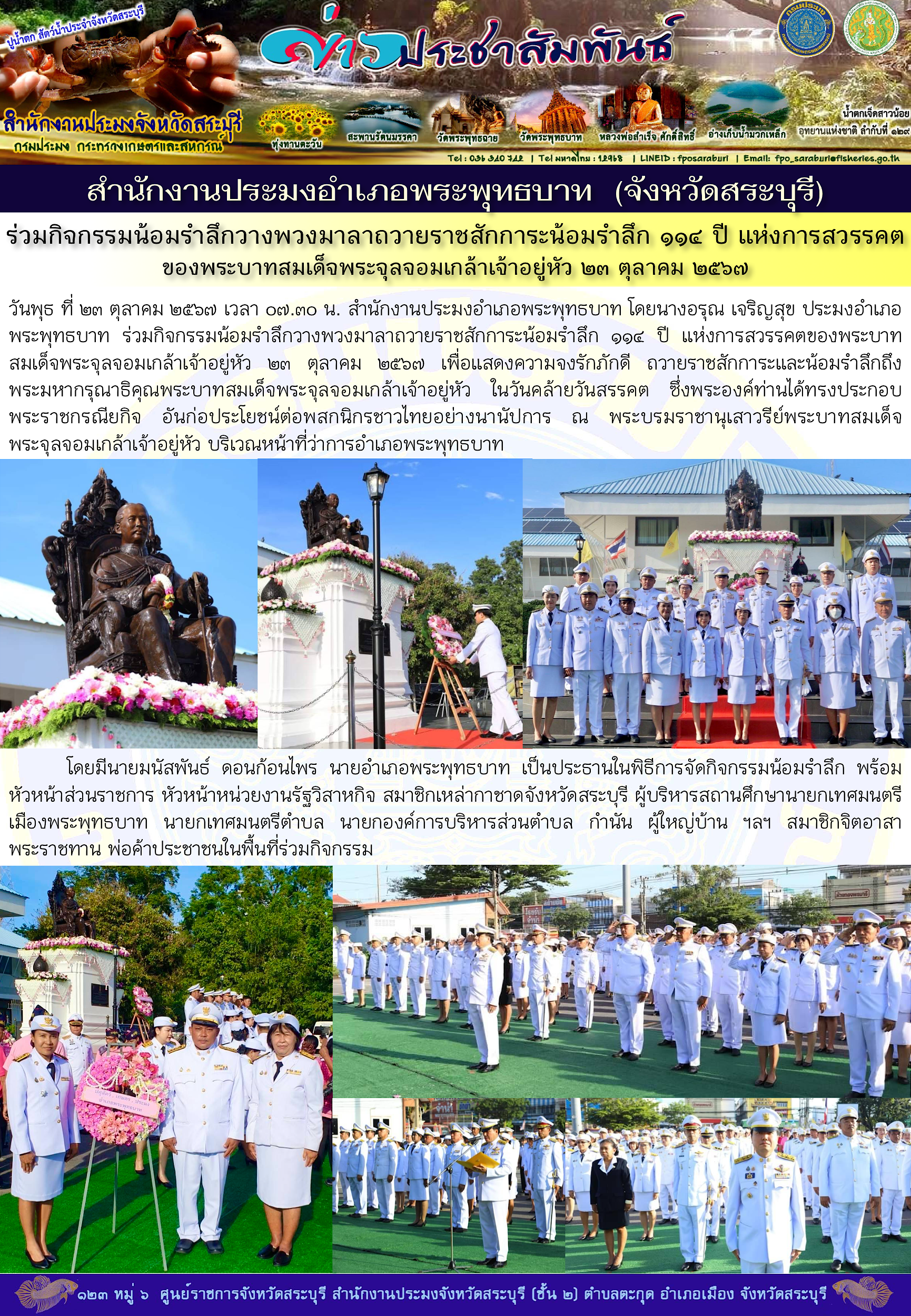 สำนักงานประมงอำเภอพระพุทธบาท ร่วมกิจกรรมน้อมรำลึกวางพวงมาลาถวายราชสักการะน้อมรำลึก ๑๑๔ ปี แห่งการสวรรคตของพระบาทสมเด็จพระจุลจอมเกล้าเจ้าอยู่หัว ๒๓ ตุลาคม ๒๕๖๗