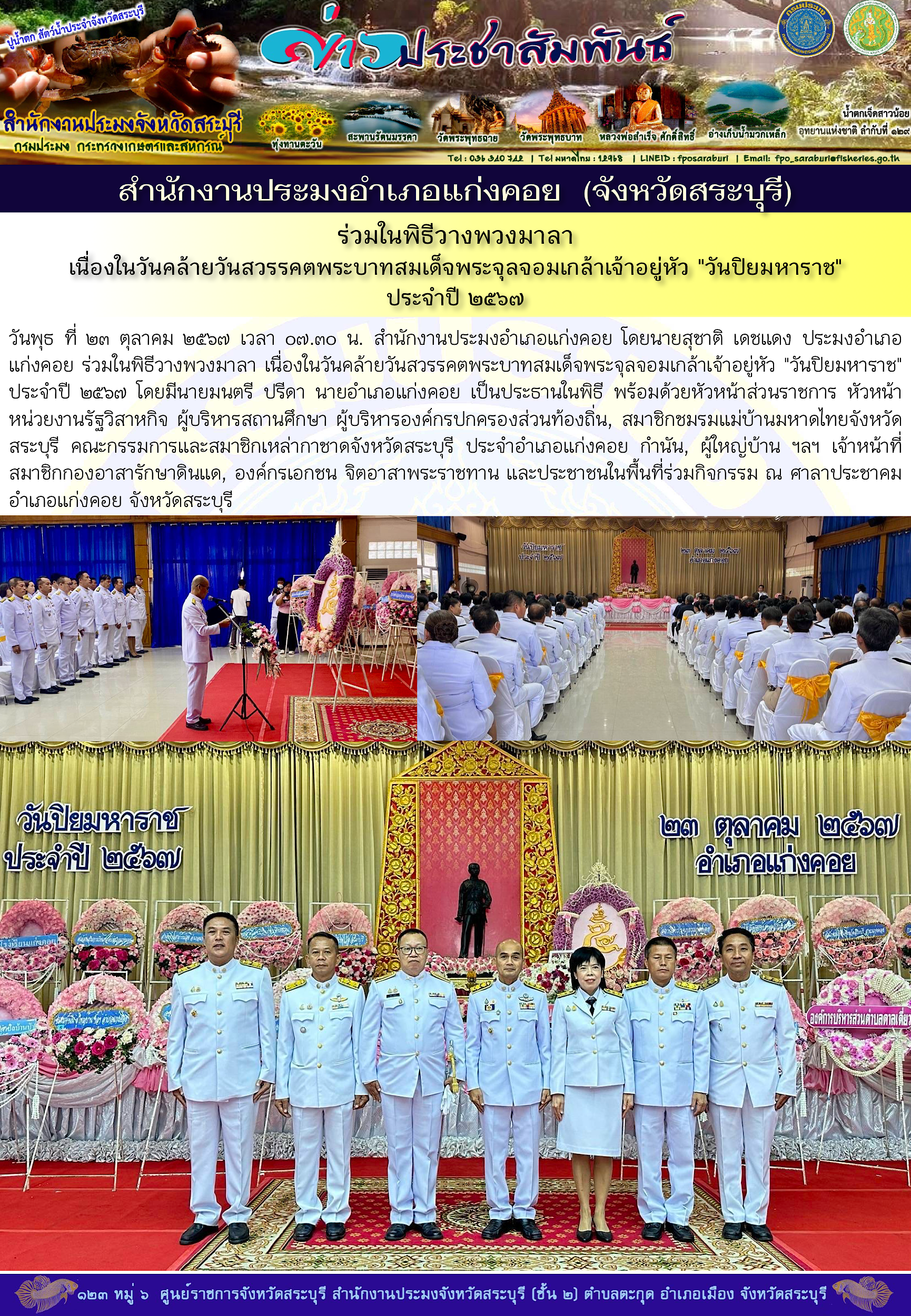 วันพุธ ที่ ๒๓ ตุลาคม ๒๕๖๗ เวลา ๐๗.๓๐ น. สำนักงานประมงอำเภอแก่งคอย โดยนายสุชาติ เดชแดง ประมงอำเภอแก่งคอย ร่วมในพิธีวางพวงมาลา เนื่องในวันคล้ายวันสวรรคตพระบาทสมเด็จพระจุลจอมเกล้าเจ้าอยู่หัว "วันปิยมหาราช" ประจำปี ๒๕๖๗ โดยมีนายมนตรี ปรีดา นายอำเภอแก่งคอย เป็นประธานในพิธี พร้อมด้วยหัวหน้าส่วนราชการ หัวหน้าหน่วยงานรัฐวิสาหกิจ ผู้บริหารสถานศึกษา ผู้บริหารองค์กรปกครองส่วนท้องถิ่น, สมาชิกชมรมแม่บ้านมหาดไทยจังหวัดสระบุรี คณะกรรมการและสมาชิกเหล่ากาชาดจังหวัดสระบุรี ประจำอำเภอแก่งคอย กำนัน, ผู้ใหญ่บ้าน ฯลฯ เจ้าหน้าที่สมาชิกกองอาสารักษาดินแดน, องค์กรเอกชน จิตอาสาพระราชทาน และประชาชนในพื้นที่ร่วมกิจกรรม ณ ศาลาประชาคมอำเภอแก่งคอย จังหวัดสระบุรี